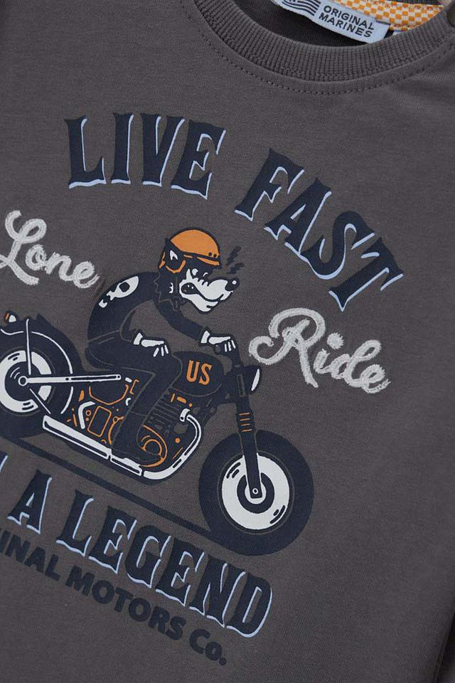 Эта стильная футболка от Original Marines станет отличным дополнением к гардеробу вашего мальчика. Футболка выполнена в сером цвете и украшена эффектным принтом с изображением мотоцикла и надписью "Live Fast Be a Legend".