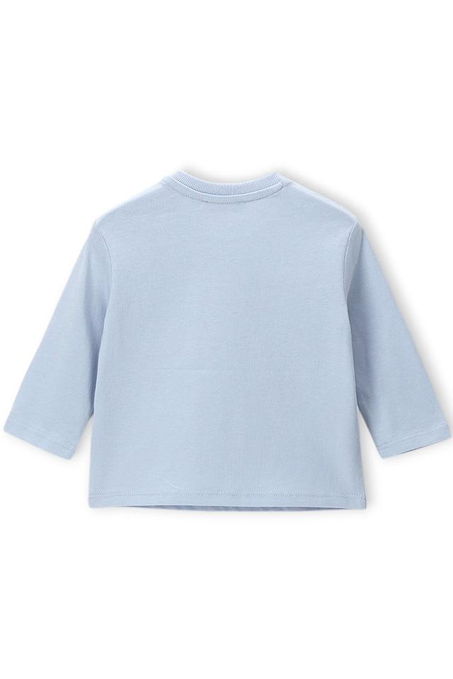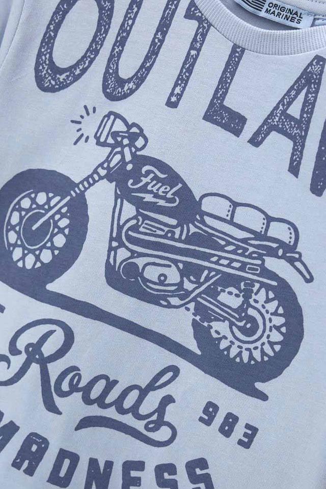 Футболка имеет голубой цвет и украшена эффектным принтом в виде мотоцикла, выполненным в графитовых и белых тонах. Принт добавляет образу динамичности и индивидуальности. Круглый вырез горловины и длинные рукава делают футболку подходящей для прохладной погоды.