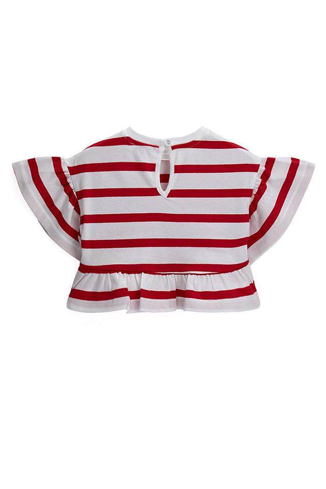 Детская футболка Original Marines красного и белого цвета с ярким принтом в виде сердца. Модель выполнена в полоску с воланами и сборкой по низу, что придает ей нарядный вид. Состав: хлопок 94%, эластан 6%