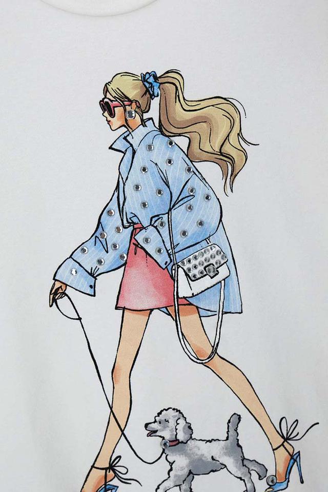 Основным элементом дизайна является красочный принт с изображением стильной девочки, выгуливающей свою собачку. Принт выполнен в ярких, но нежных тонах, что делает футболку особенно привлекательной для девочек.
