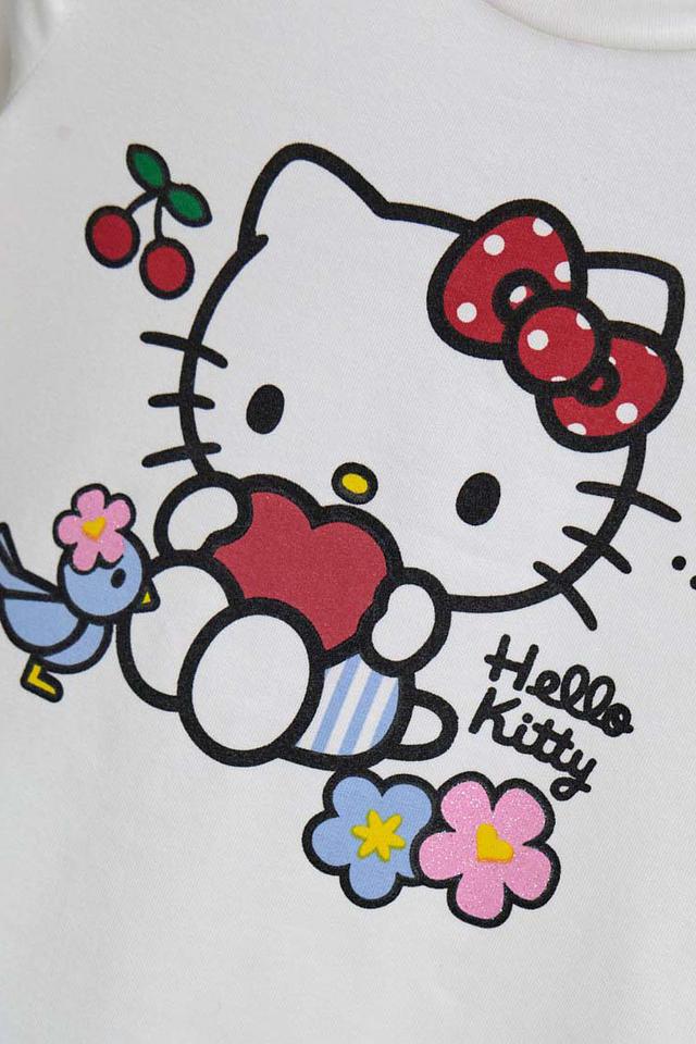 Основным украшением футболки является красочный принт с изображением всеми любимой героини Hello Kitty. Принт выполнен в ярких и насыщенных цветах, что делает футболку особенно привлекательной для детей.