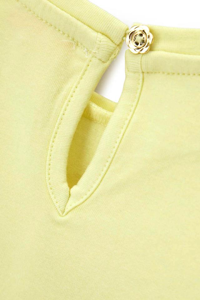 Модель имеет короткие рукава-фонарики, которые придают образу игривость и кокетство. Вырез горловины оформлен аккуратной планкой с декоративной пуговицей в виде цветочка. Футболка выполнена из высококачественного хлопка с добавлением эластана, что обеспечивает мягкость, комфорт и удобство в носке.