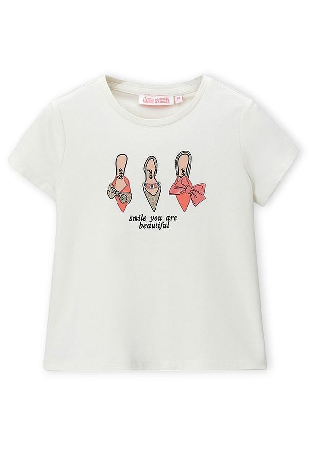 Белая футболка Original Marines для девочки с ярким принтом туфель и надписью "smile you are beautiful". Изготовлена из мягкого хлопка с добавлением эластана для комфорта и свободы движений. Состав: хлопок 92%, эластан 8%