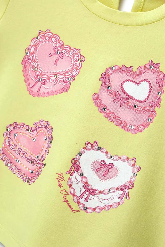 Модель имеет длинные рукава и классический круглый вырез горловины. Главной особенностью футболки является яркий принт, изображающий розовые сердечки с декоративной отделкой и бантиками. Принт выполнен в нежных тонах и придает образу игривость и очарование.