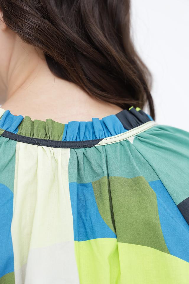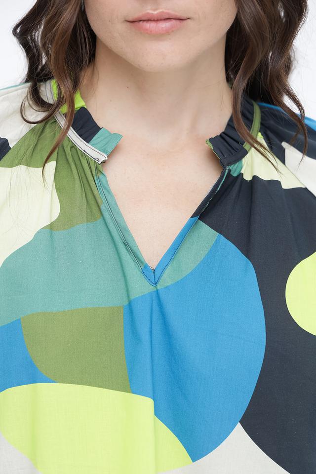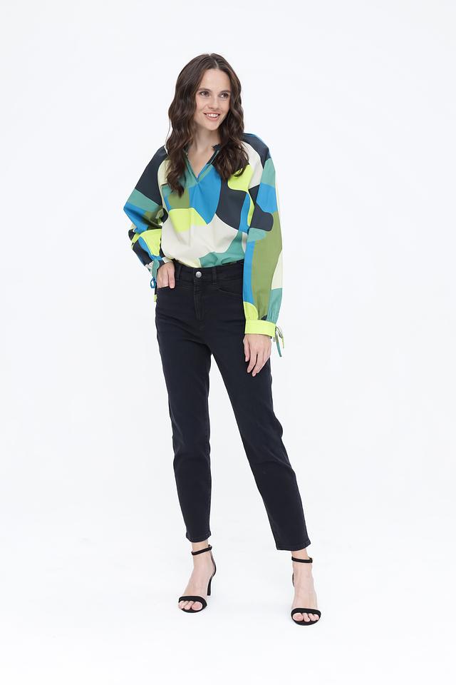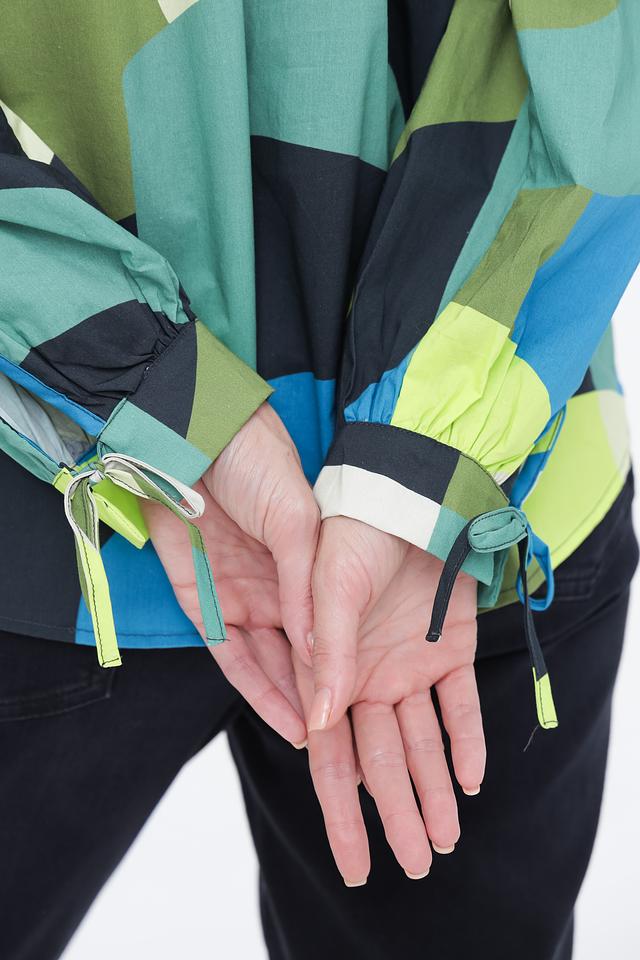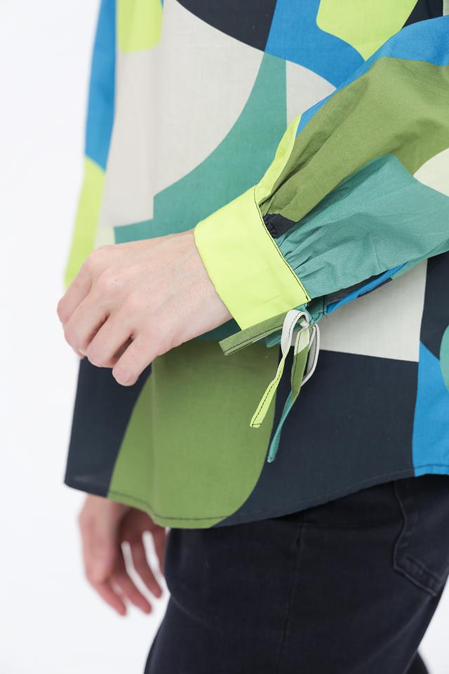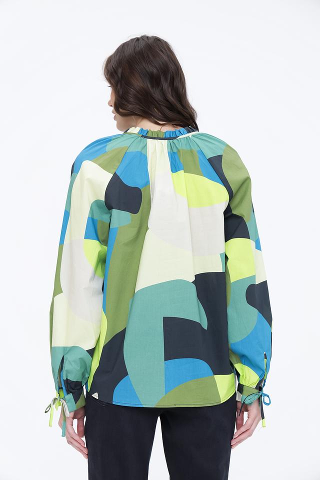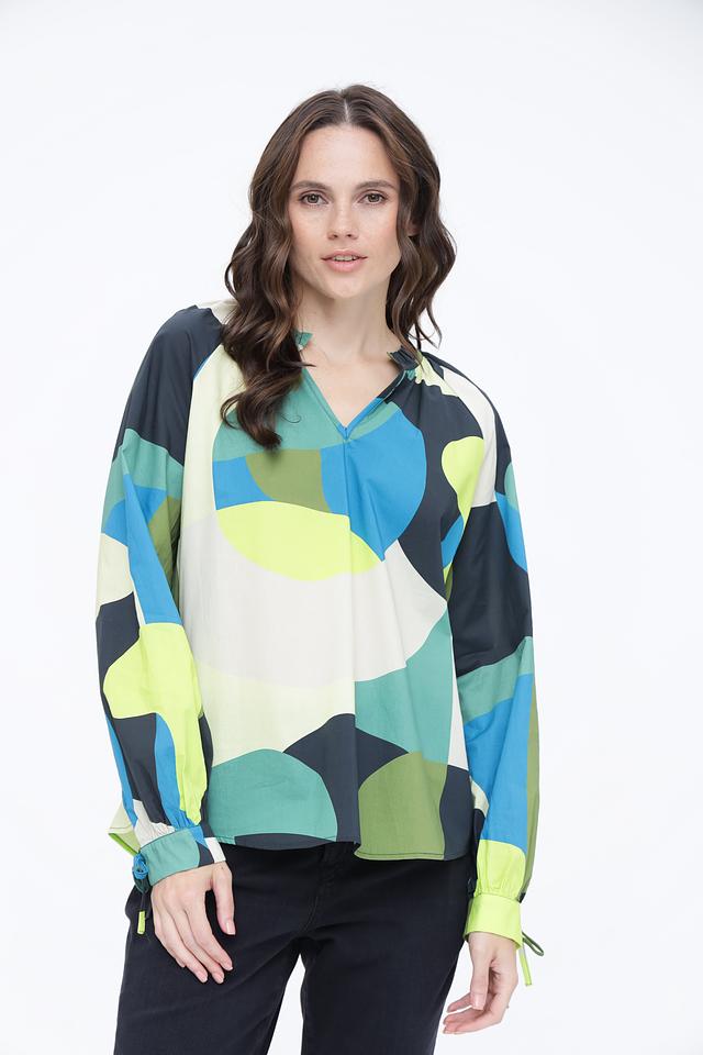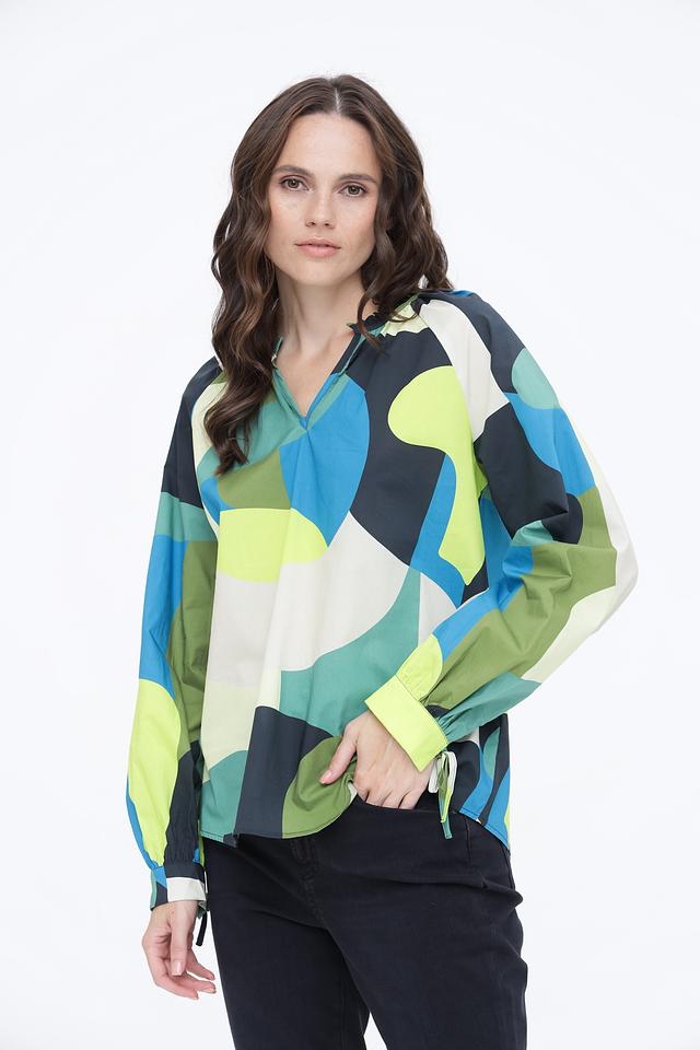 Блуза отличается оригинальным дизайном с абстрактным геометрическим принтом, сочетающим в себе оттенки синего, зеленого, желтого и белого. V-образный вырез горловины подчеркивает женственность, а длинные рукава с манжетами на завязках позволяют регулировать их длину и создавать различные силуэты.