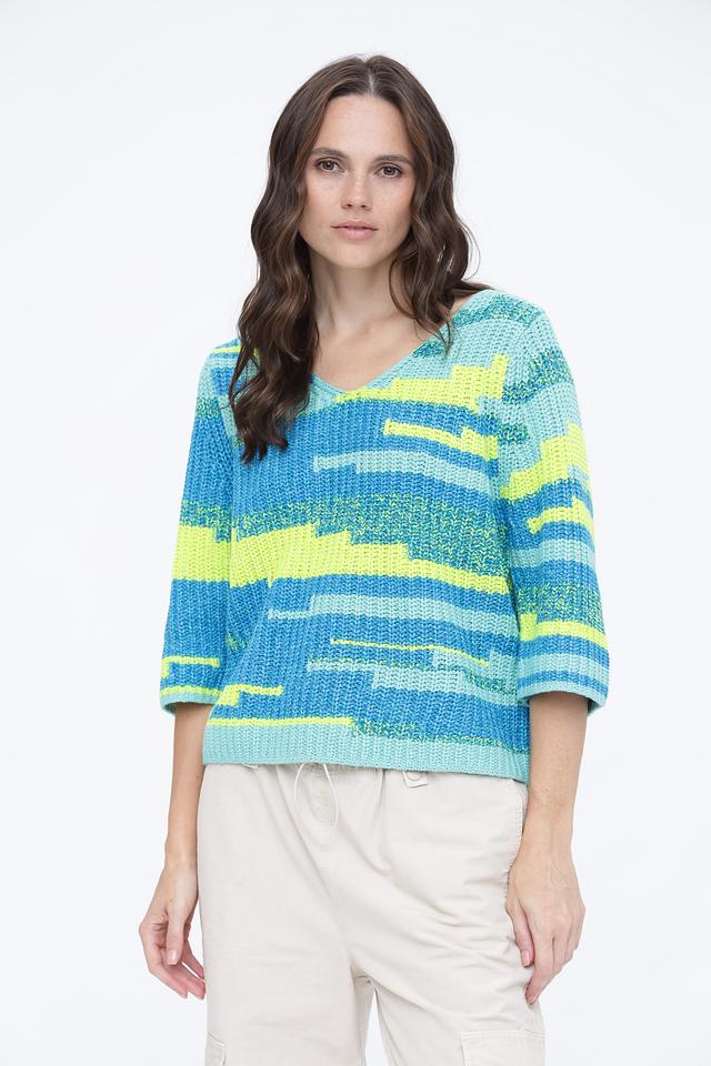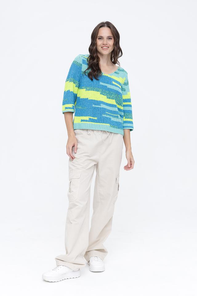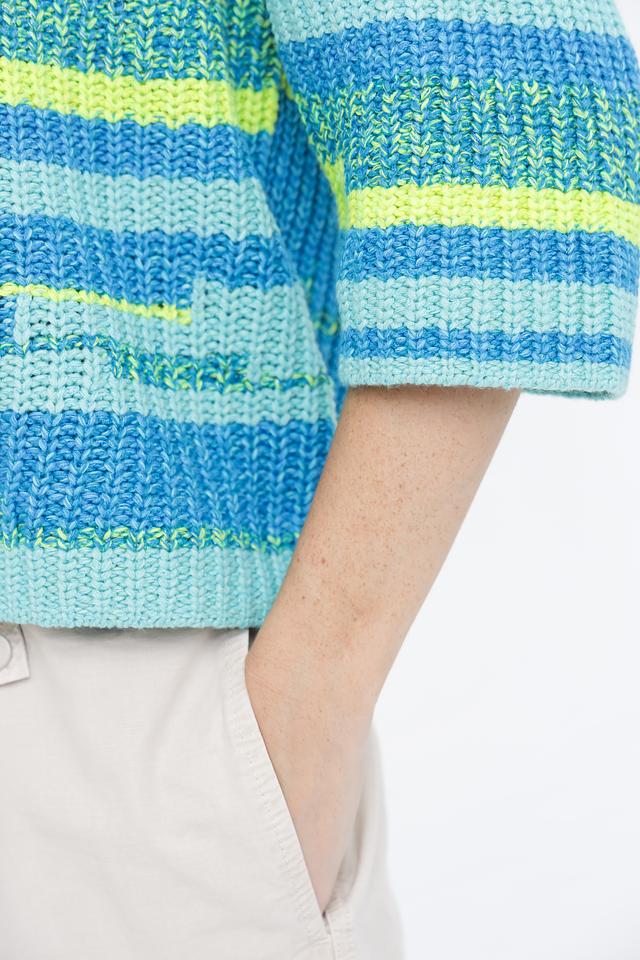Женский пуловер Oui бирюзового цвета с v-образным вырезом и укороченным рукавом. Модель выполнена в яркой полосатой расцветке, которая добавит образу свежести и оригинальности. Пуловер изготовлен из мягкого и приятного к телу сочетания хлопка и акрила. Состав: хлопок 49%, полиакрил 36%, полиэстер 9%, полиамид 6%