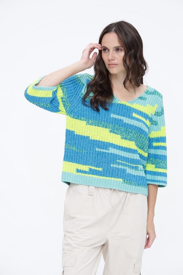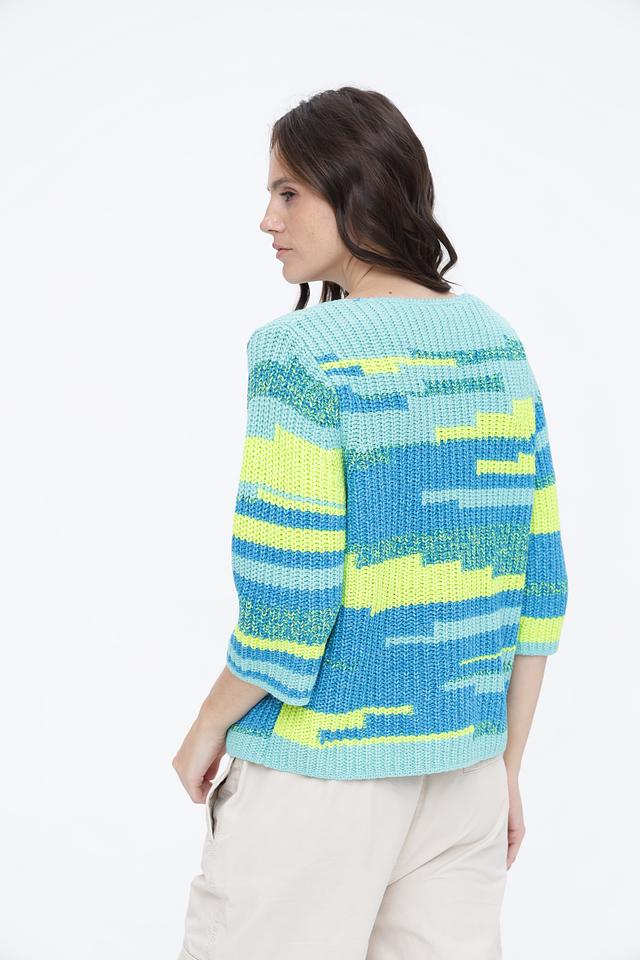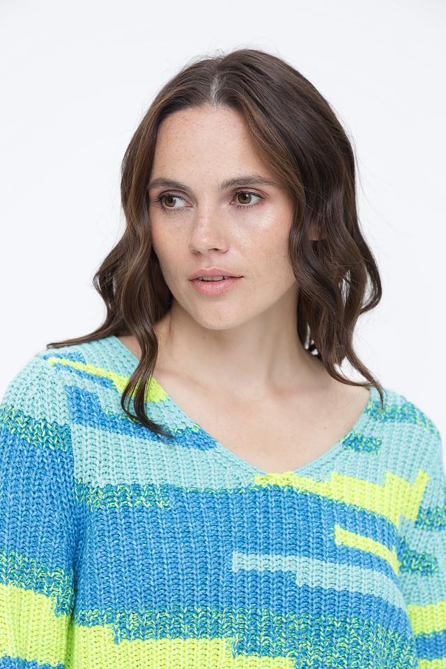Этот стильный пуловер от бренда Oui станет отличным дополнением к вашему гардеробу. Модель выполнена в яркой бирюзовой цветовой гамме с добавлением лаймовых и светло-голубых полос, создающих динамичный и запоминающийся образ.