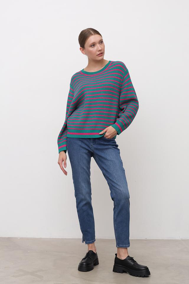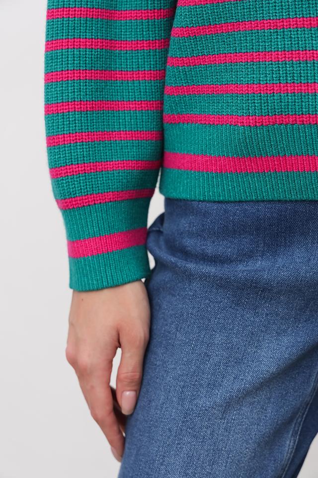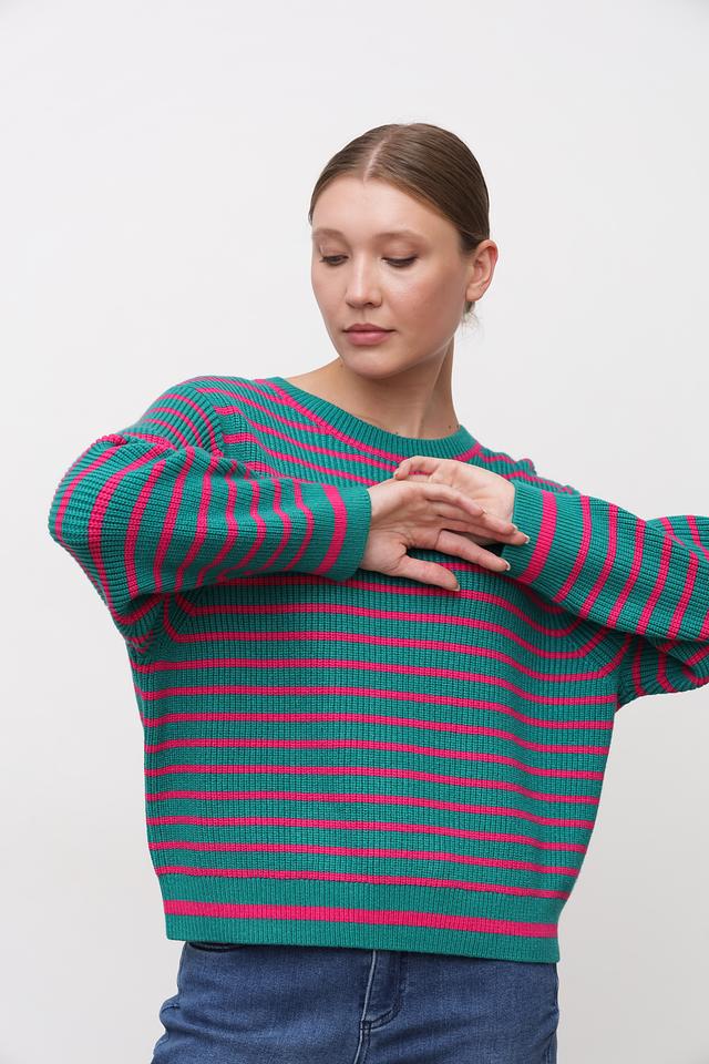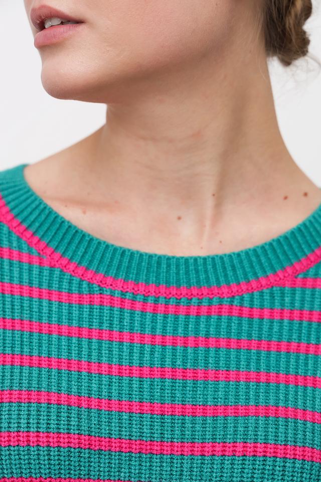 Пуловер имеет классический крой с круглым вырезом горловины и длинными рукавами. Горизонтальная полоска в сочетании зеленого и розового цветов придает изделию свежий и современный вид. Текстура полотна – мелкая вязка.