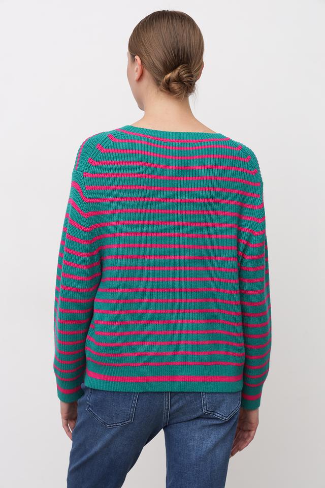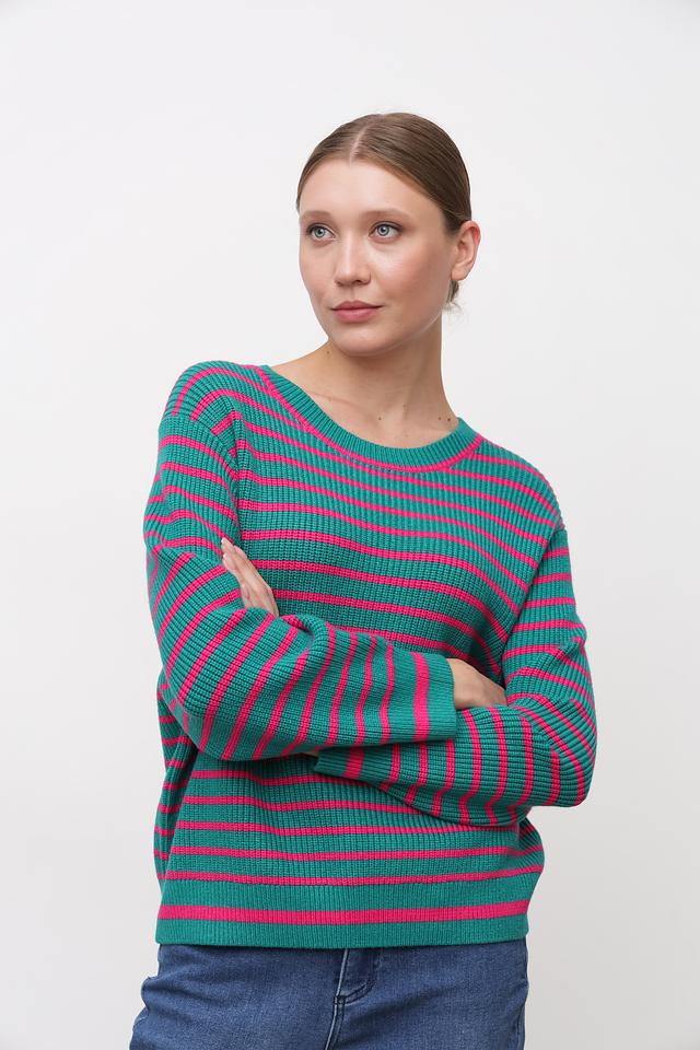 Женский пуловер Oui зеленого и розового цвета в горизонтальную полоску. Модель выполнена из мягкого трикотажа с круглым вырезом горловины и рукавами средней длины. Состав: вискоза 50%, полиэстер 28%, полиамид 22%