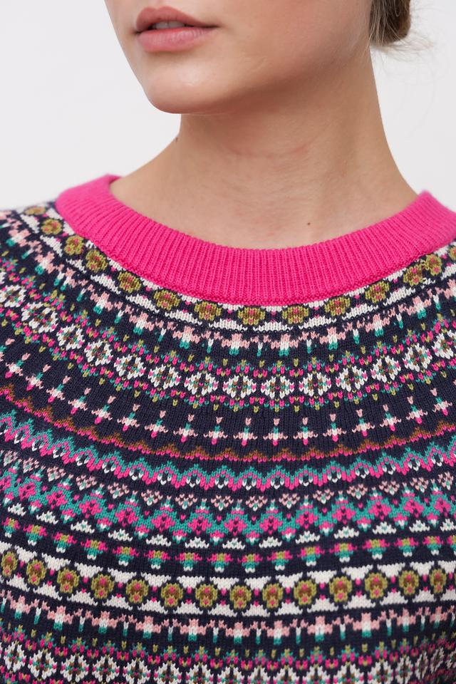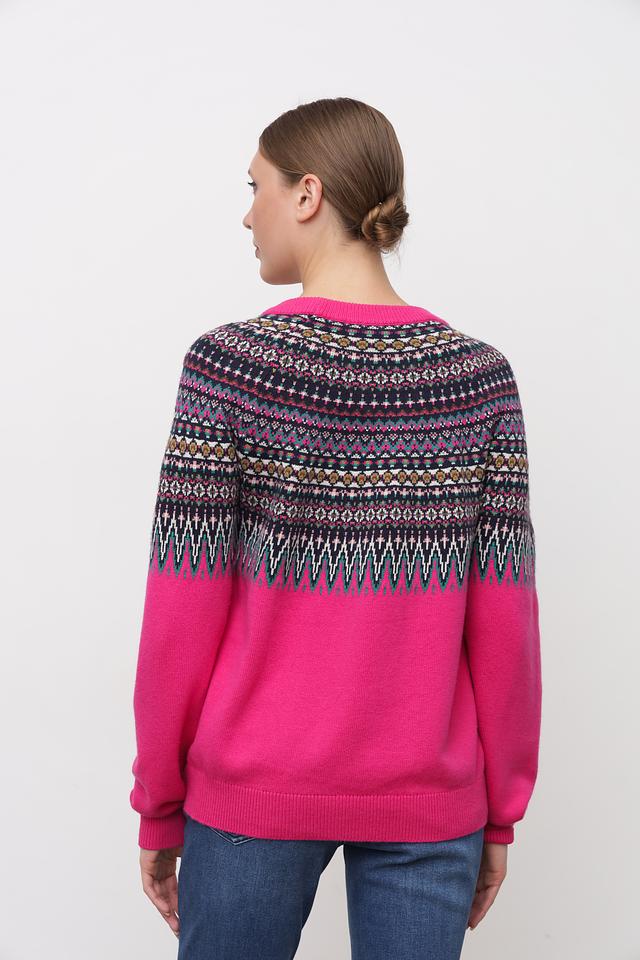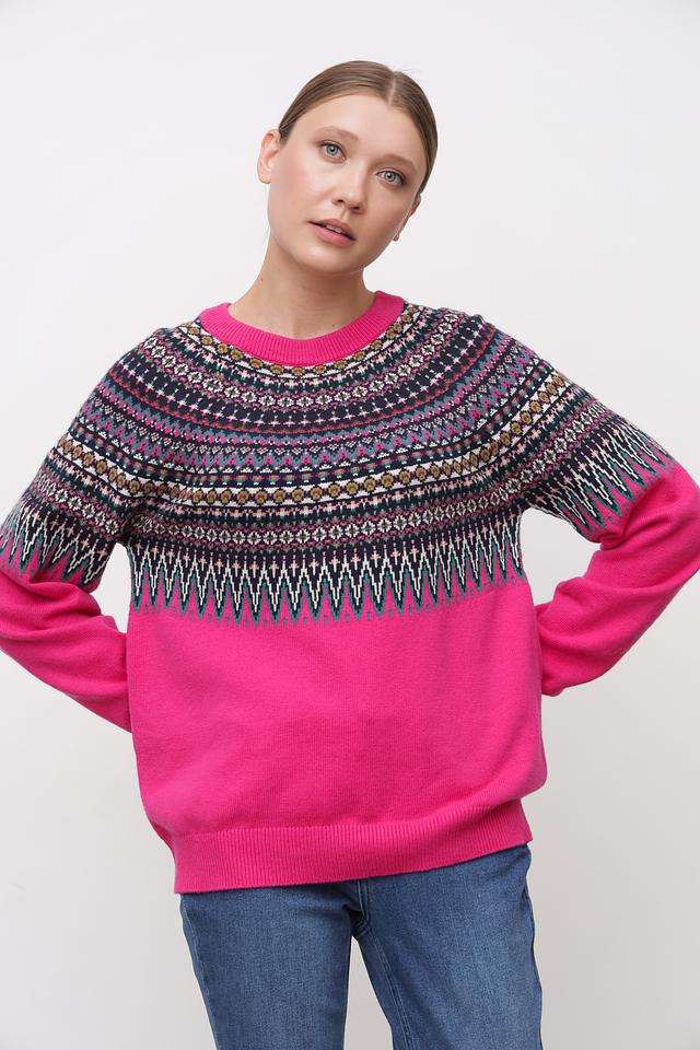 Этот пуловер от Oui – прекрасное дополнение к вашему гардеробу. Он выполнен в насыщенном малиновом цвете и украшен сложным жаккардовым узором в тёмных тонах, что придает ему особый шарм.