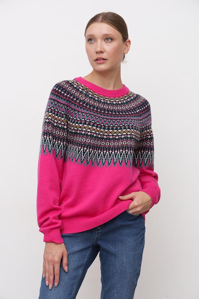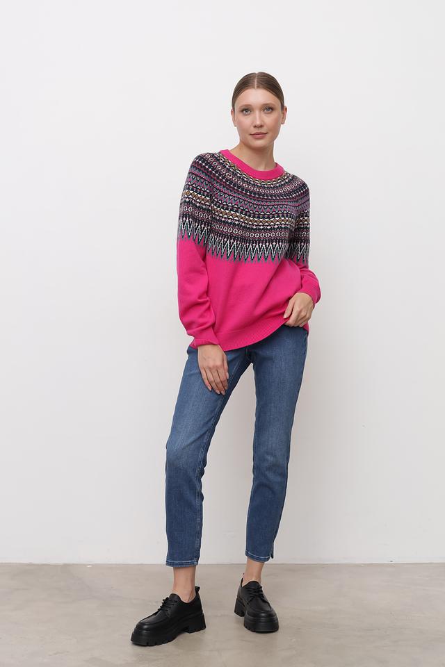 Малиновый пуловер от Oui с ярким жаккардовым узором. Изготовлен из мягкой смеси полиамида, хлопка и вискозы, обеспечивающей комфорт и удобство в носке. Идеальный выбор для создания стильного и уютного образа. Состав: полиамид 43%, хлопок 30%, вискоза 27%