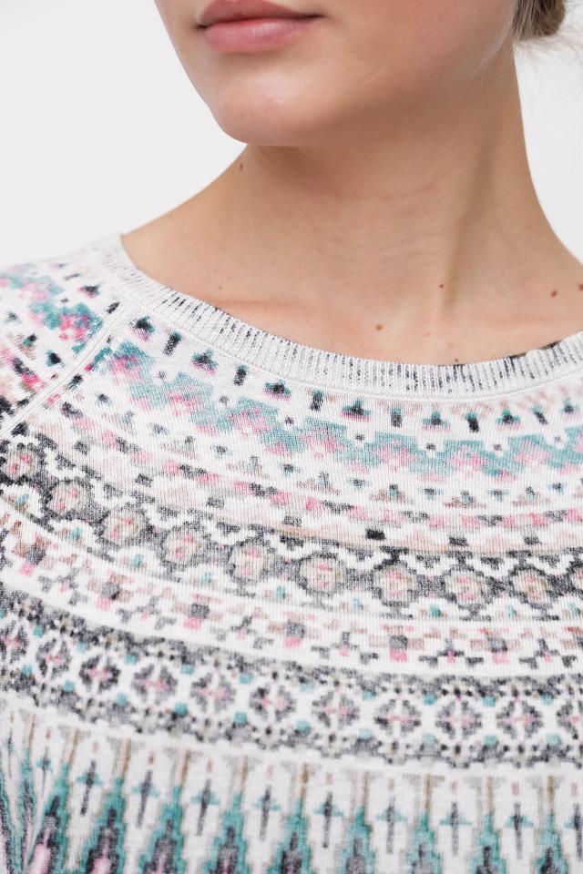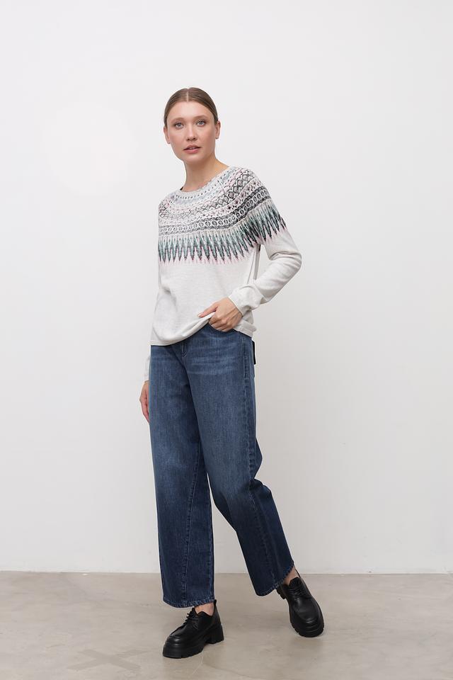 Основной цвет пуловера – светло-серый, который служит идеальным фоном для яркого и детализированного жаккардового узора. Узор выполнен в сочетании зелёных, голубых, розовых и чёрных оттенков, создавая эффектный и запоминающийся образ.