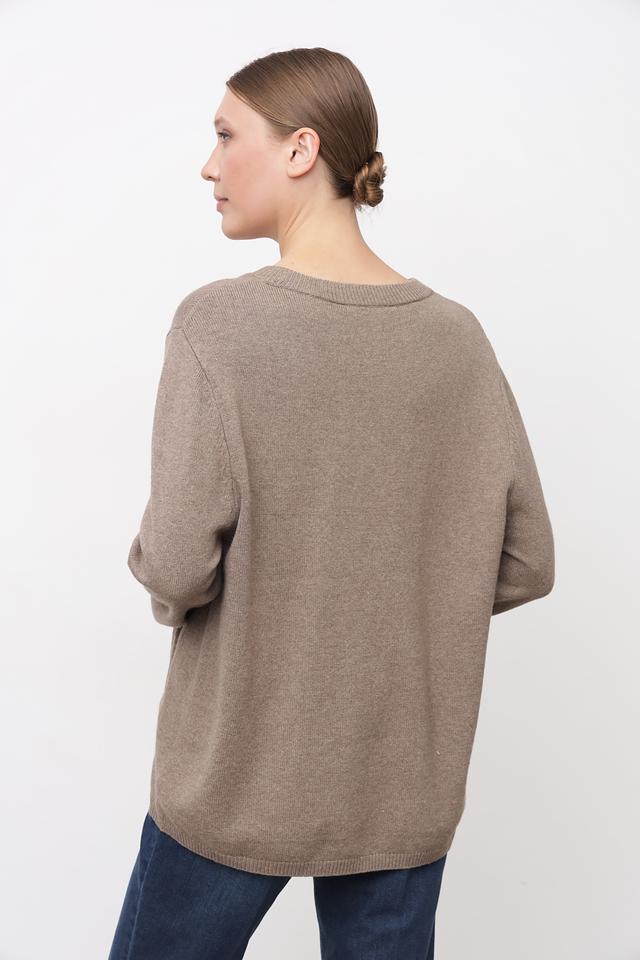 Пуловер имеет свободный крой, который не сковывает движений и позволяет создать расслабленный образ. Округлый вырез горловины и длинные рукава делают его универсальным для различных погодных условий.
