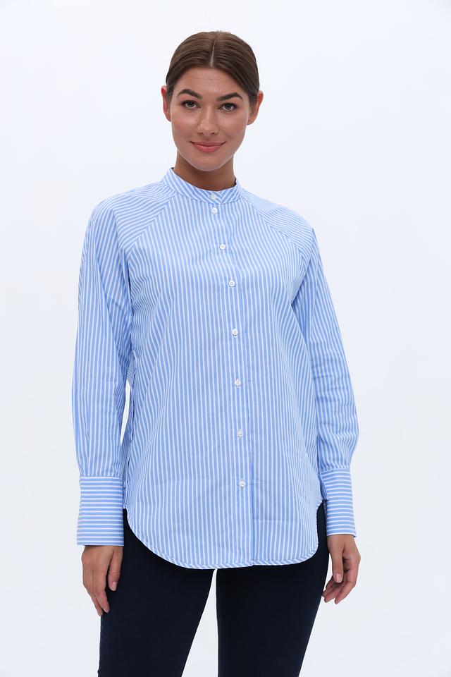 Вертикальная полоска голубого и белого цветов визуально вытягивает силуэт и делает образ более динамичным. Рубашка идеально подходит для создания как повседневных, так и более формальных образов.