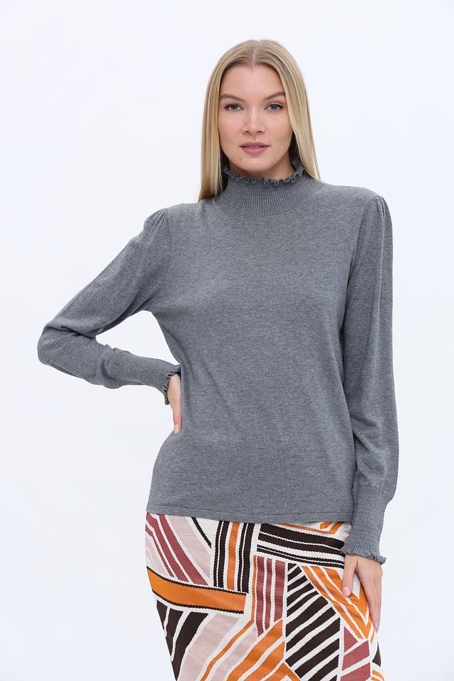 Этот стильный пуловер от бренда Oui выполнен в сером цвете и станет универсальным элементом вашего гардероба. Модель имеет прямой крой и воротник-стойку, украшенный нежной оборкой, что придает ей изысканность.