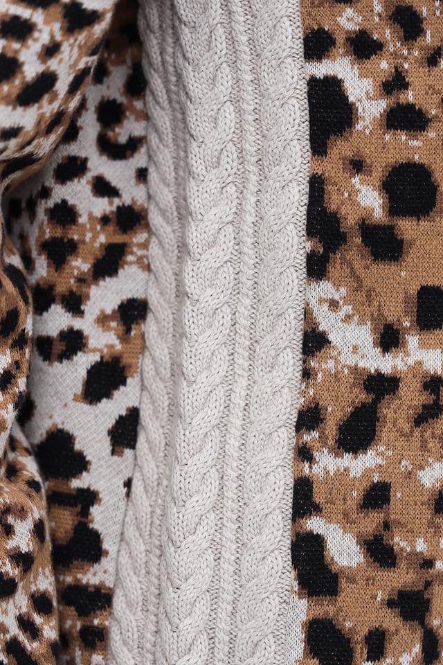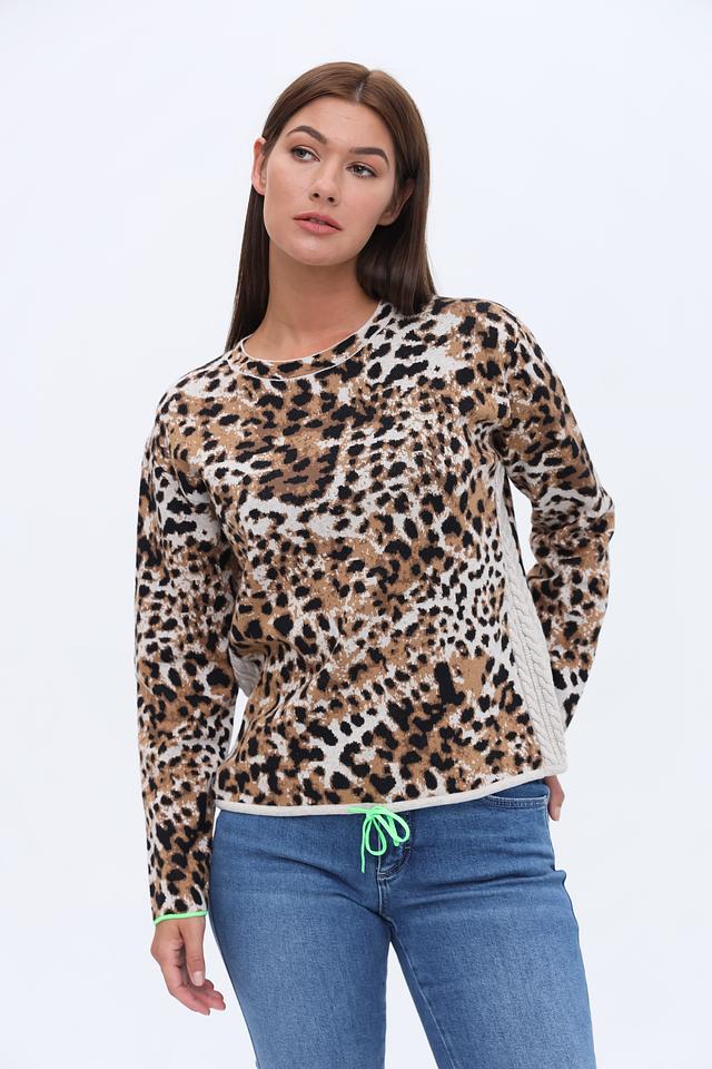 Основной цвет пуловера – бежевый, но его главным акцентом является яркий леопардовый принт, который придает изделию оригинальность и динамичность. Округлый вырез горловины и длинные рукава обеспечивают удобную посадку по фигуре. По бокам пуловер имеет вставки из стеганой ткани, что добавляет ему текстуры и объема.