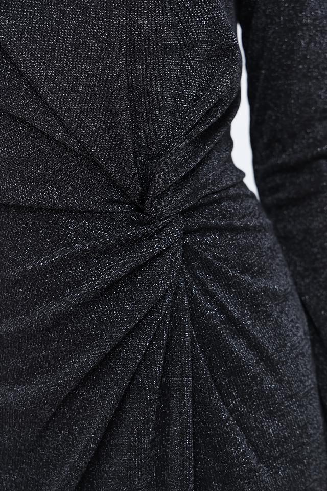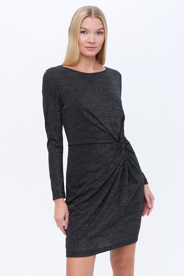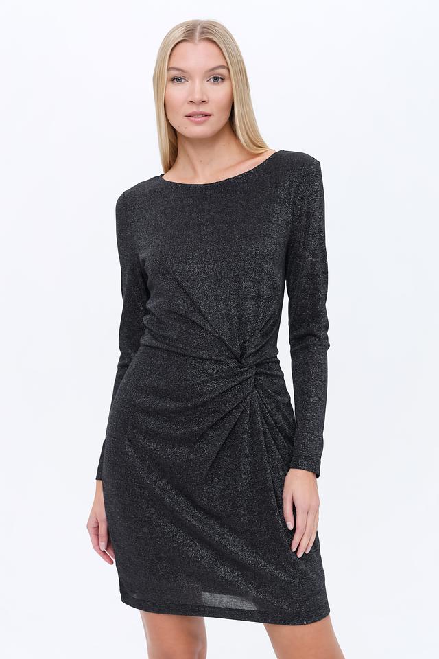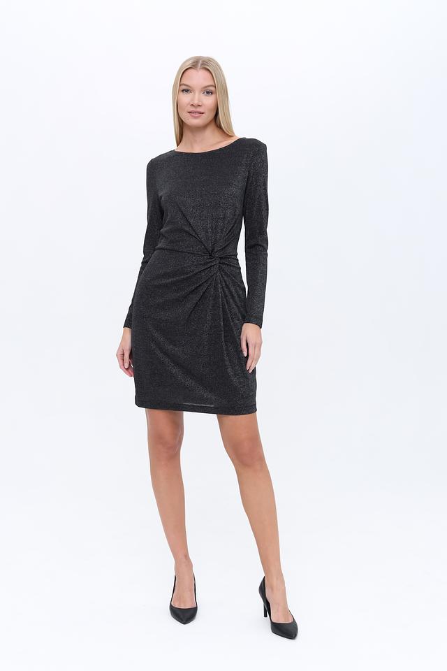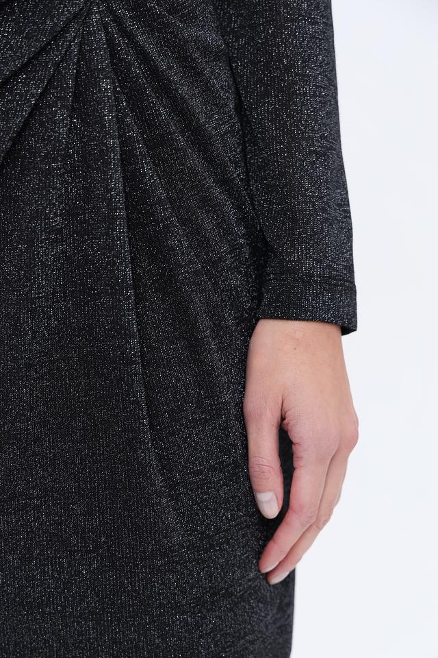 Чёрное платье от Oui с длинными рукавами и эффектным запахом на талии. Изготовлено из струящейся ткани с добавлением металлизированной нити, что придает изделию благородный блеск и изысканный вид. Состав: вискоза 62%, метализ.нить 36%, эластан 2%