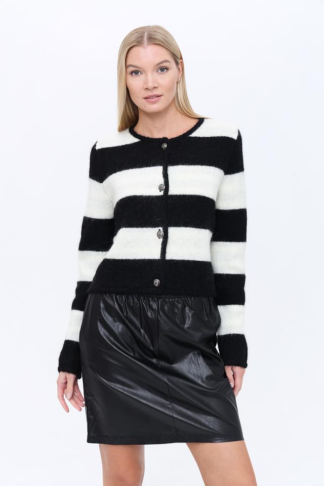 Чёрно-белая полоска придает жакету динамичный и современный вид. Модель выполнена из высококачественного трикотажа, в состав которого входит 40% мохер, 36% полиакрил, 13% хлопок и 11% шерсть. Благодаря этому сочетанию материалов жакет приятен на ощупь, хорошо держит форму и обеспечивает комфорт в носке.