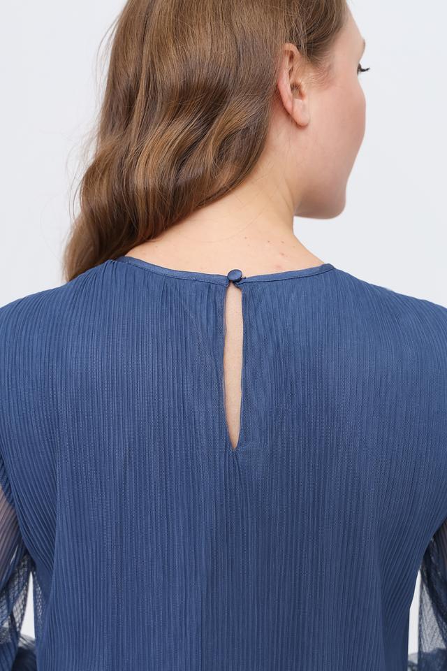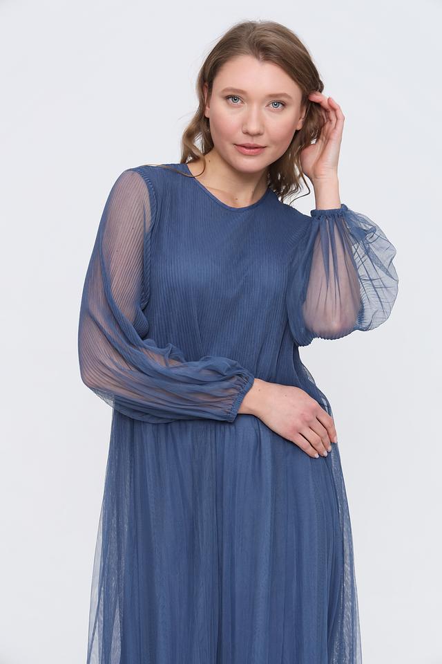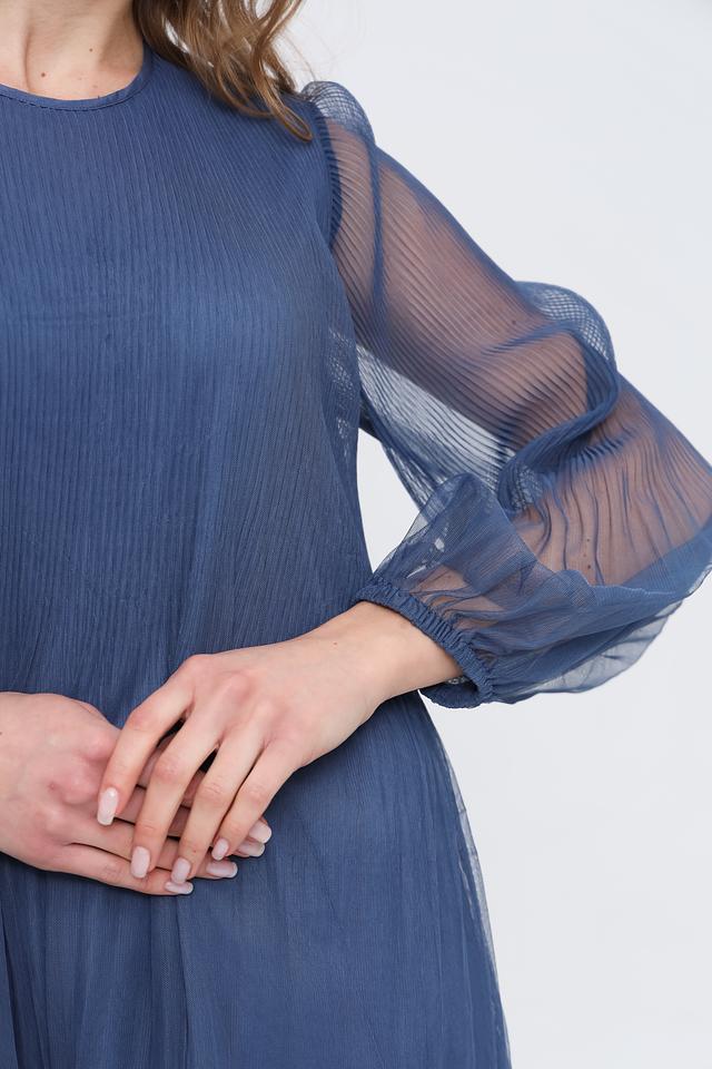 Платье выполнено в насыщенном синем цвете. Верхняя часть платья и рукава выполнены из полупрозрачной ткани, создающей эффект легкости. Рукава – фонарики, длиной три четверти.