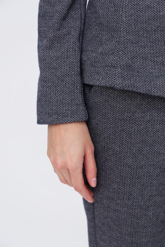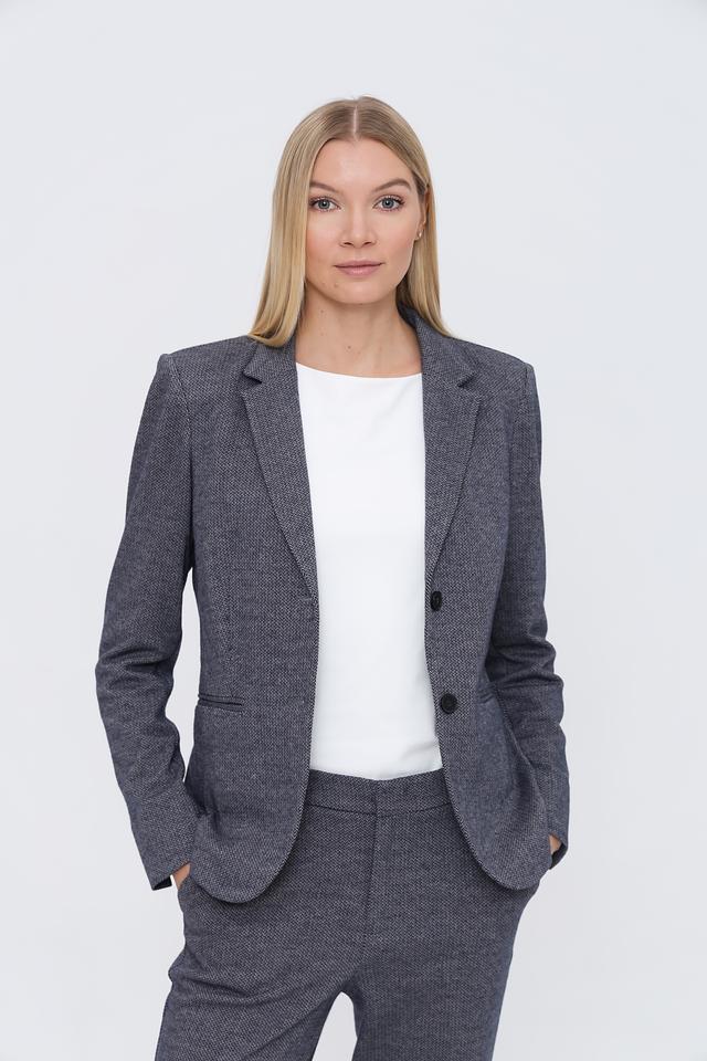 Состав ткани: 66% полиэстер, 31% вискоза, 3% эластан. Это сочетание материалов обеспечивает жакету приятные тактильные ощущения, хорошую посадку по фигуре и устойчивость к сминанию.