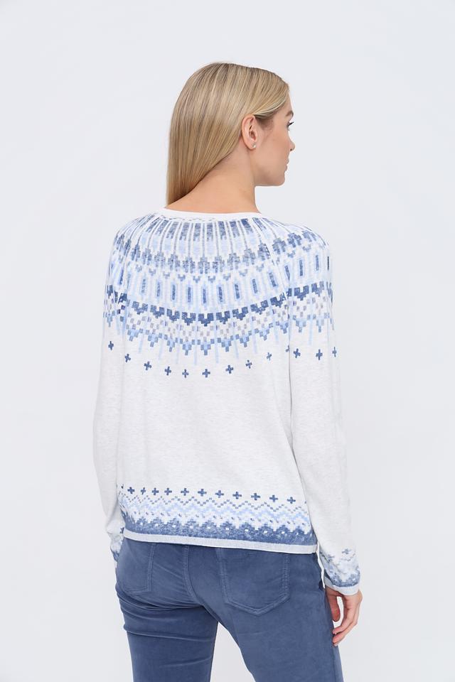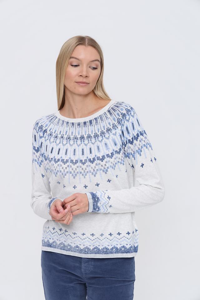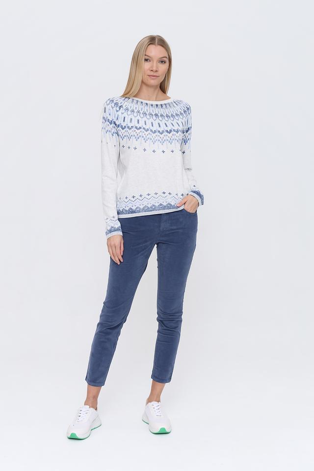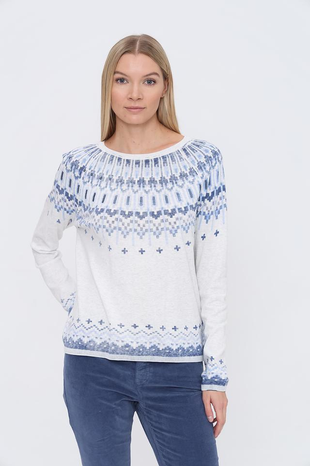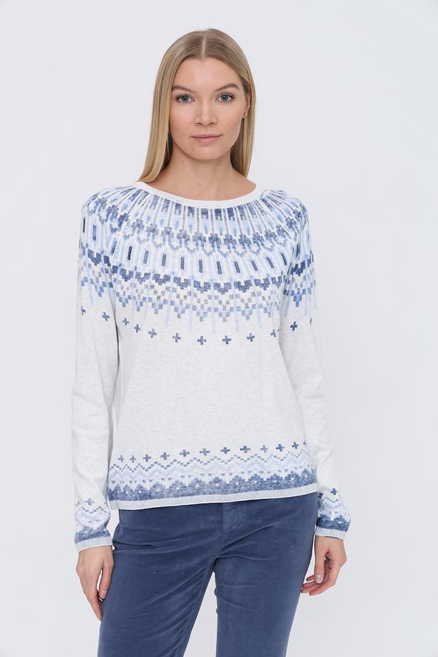 Этот стильный пуловер от бренда Oui выполнен в белом цвете и украшен ярким жаккардовым узором в голубых тонах. Модель имеет классический крой с длинными рукавами и круглым вырезом горловины.