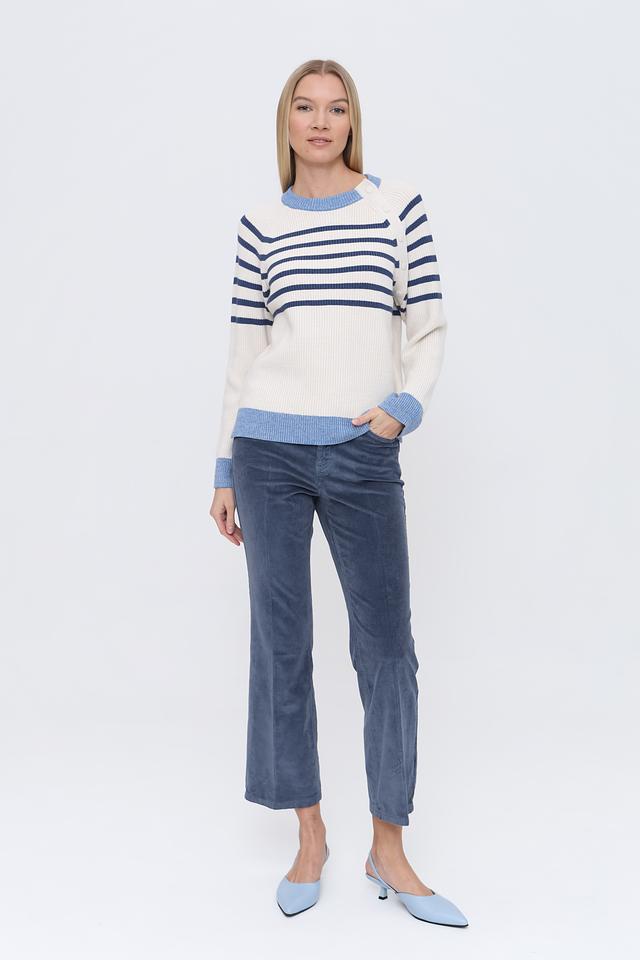 Этот стильный пуловер от Oui станет прекрасным дополнением к вашему гардеробу. Он выполнен в кремовом цвете с контрастными синими полосами, что придает ему свежий и современный вид.