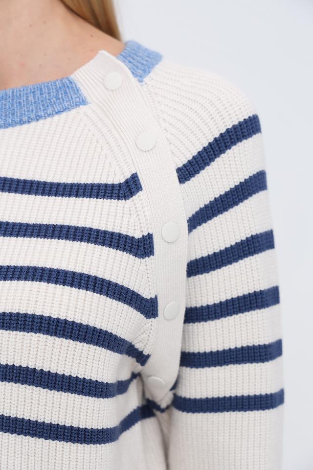 Пуловер имеет удобный круглый вырез горловины и длинные рукава. Голубая отделка на горловине, манжетах и по низу изделия добавляет изысканности. Декоративные пуговицы на плече придают модели особый шарм.