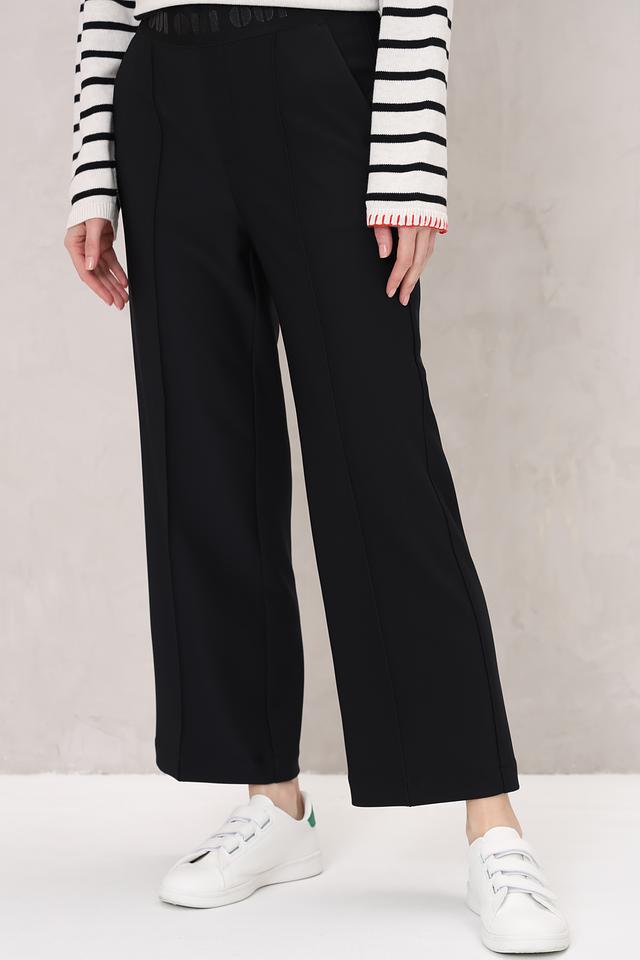 Модель имеет прямой крой и клёш от колена, что визуально удлиняет ноги и придает образу женственность. Брюки оснащены эластичным поясом, обеспечивающим удобную посадку по фигуре. Наличие продольных вытачек спереди добавляет брюкам элегантности и подчеркивает силуэт.