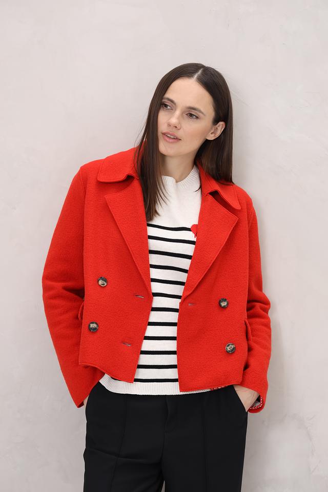 Жакет выполнен из высококачественной 100% шерсти, что обеспечивает комфорт и тепло в прохладную погоду. Двубортная застежка на пуговицы подчеркивает элегантность силуэта. У жакета есть функциональные карманы.