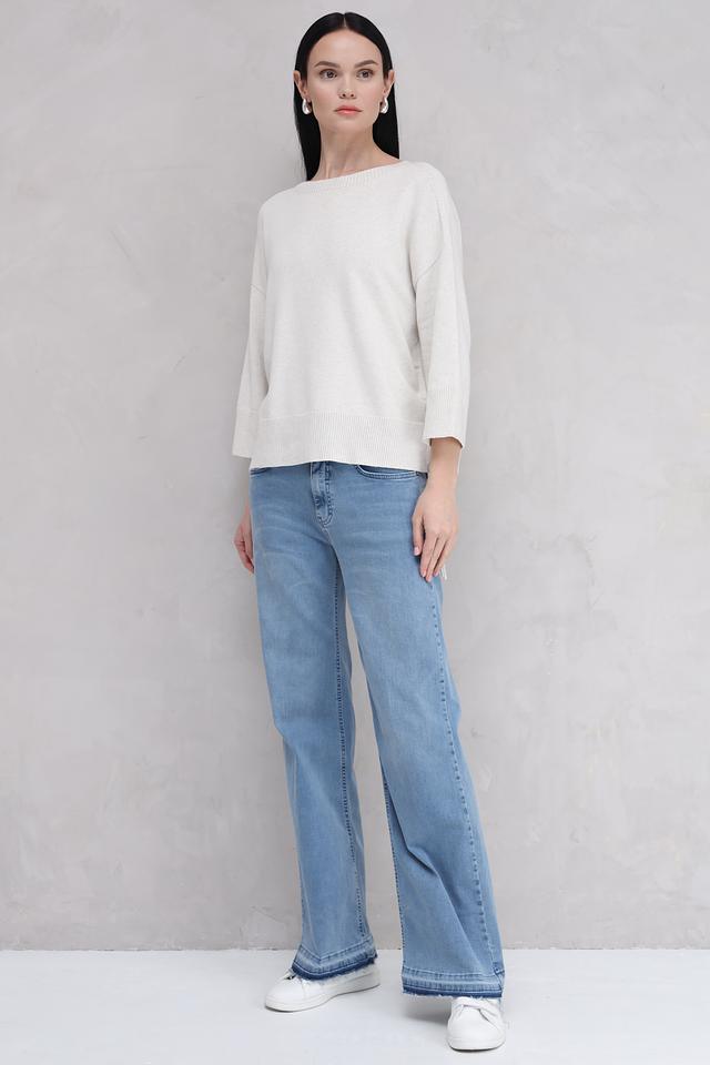 Пуловер имеет округлый вырез горловины и рукава три четверти, что делает его универсальным для различных образов. Текстура трикотажа приятна на ощупь и хорошо держит форму.