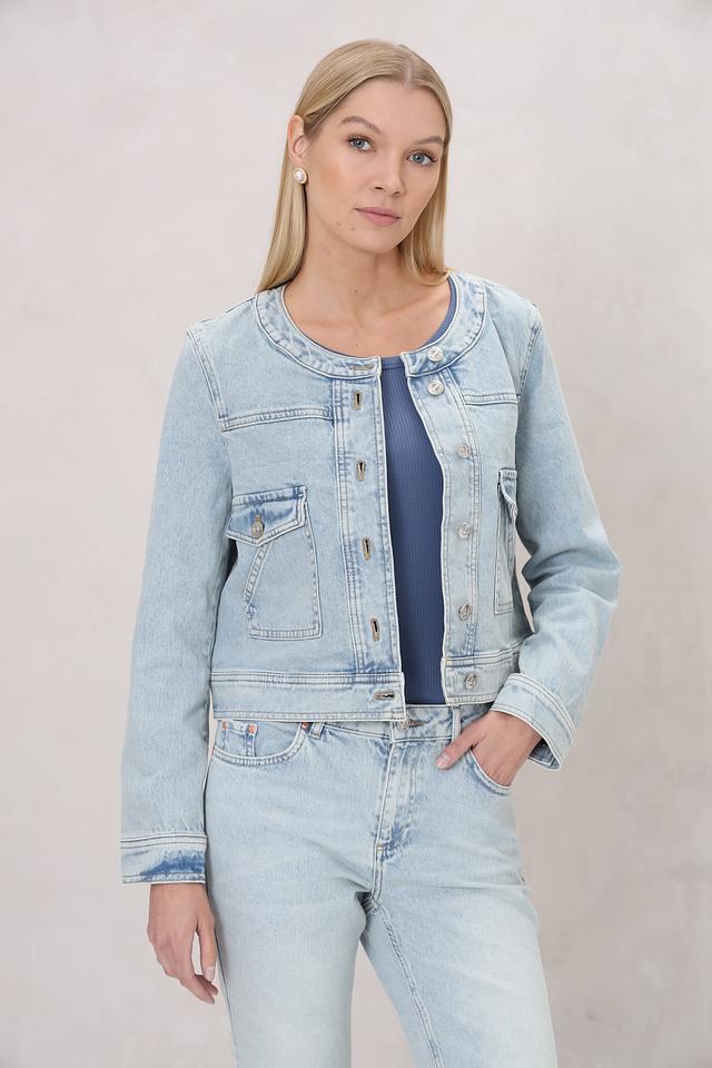 Жакет Oui голубого цвета выполнен из денима с застежкой на пуговицы. Модель имеет короткий крой и накладные карманы, что придает ей стильный и современный вид. Идеально дополнит повседневный образ. Состав: хлопок 97%, полиэстер 2%, эластан 1%