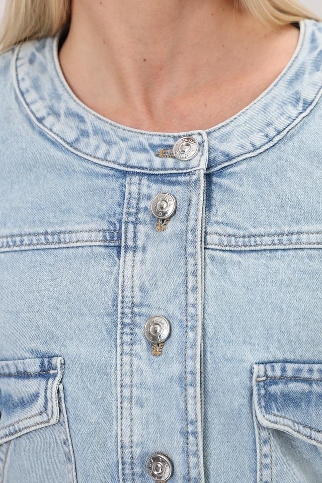 Жакет имеет короткий, слегка приталенный силуэт, который подчеркивает фигуру. Застежка на пуговицы обеспечивает удобство ношения, а накладные карманы добавляют практичности и непринужденности образу. Отложной воротник придает модели завершенный вид.