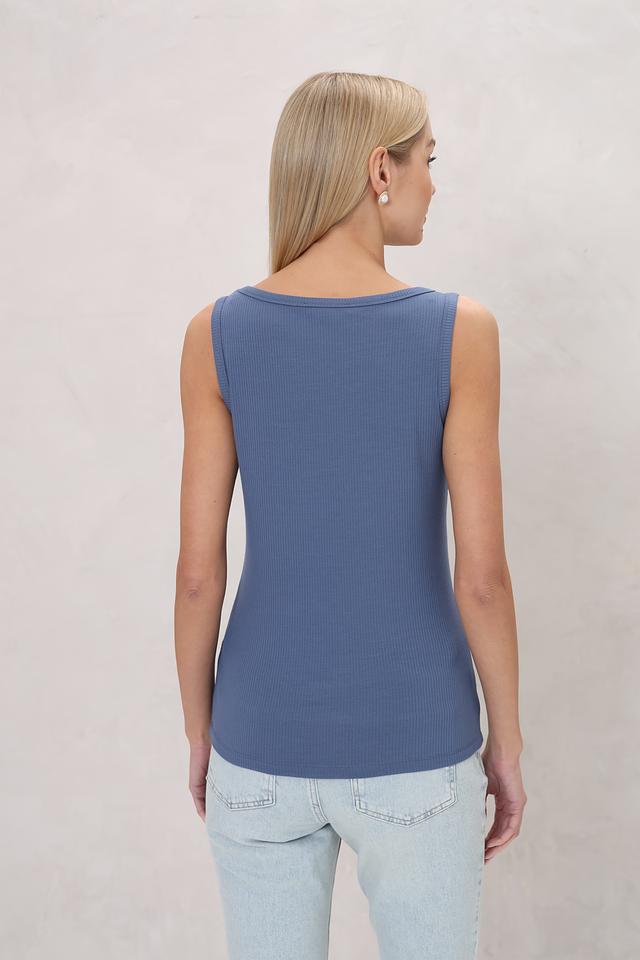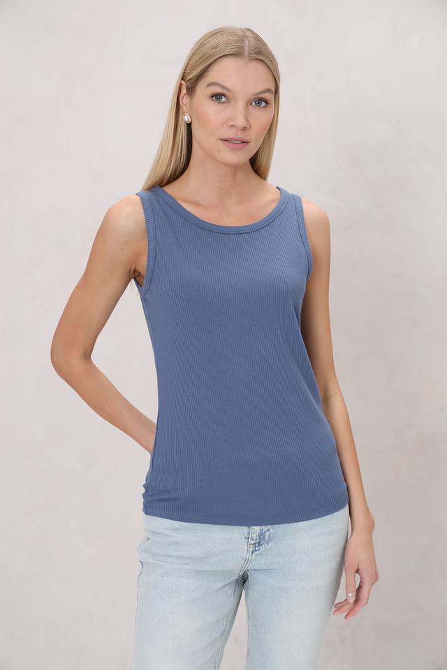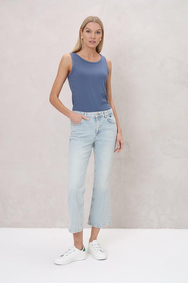 Топ имеет классический крой с округлым вырезом горловины и широкими бретелями. Ткань приятна на ощупь и хорошо тянется, обеспечивая свободу движений. Благодаря составу из 95% вискозы и 5% эластана, изделие не мнется и сохраняет форму в течение всего дня.