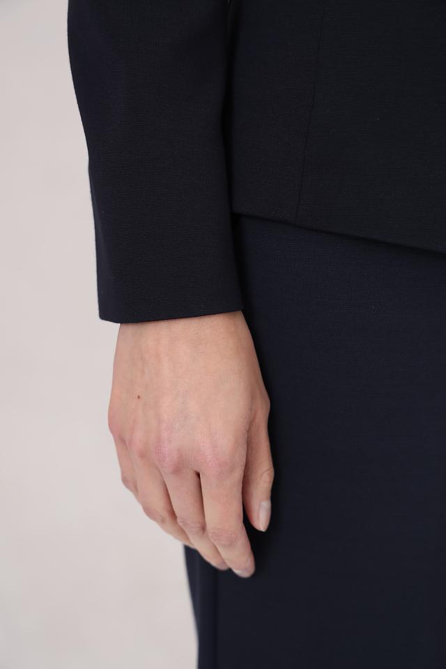 Состав ткани: 65% вискоза, 30% полиамид, 5% эластан. Этот состав обеспечивает приятные тактильные ощущения, хорошую посадку и лёгкость в уходе. Жакет идеально подходит для создания деловых и повседневных образов.
