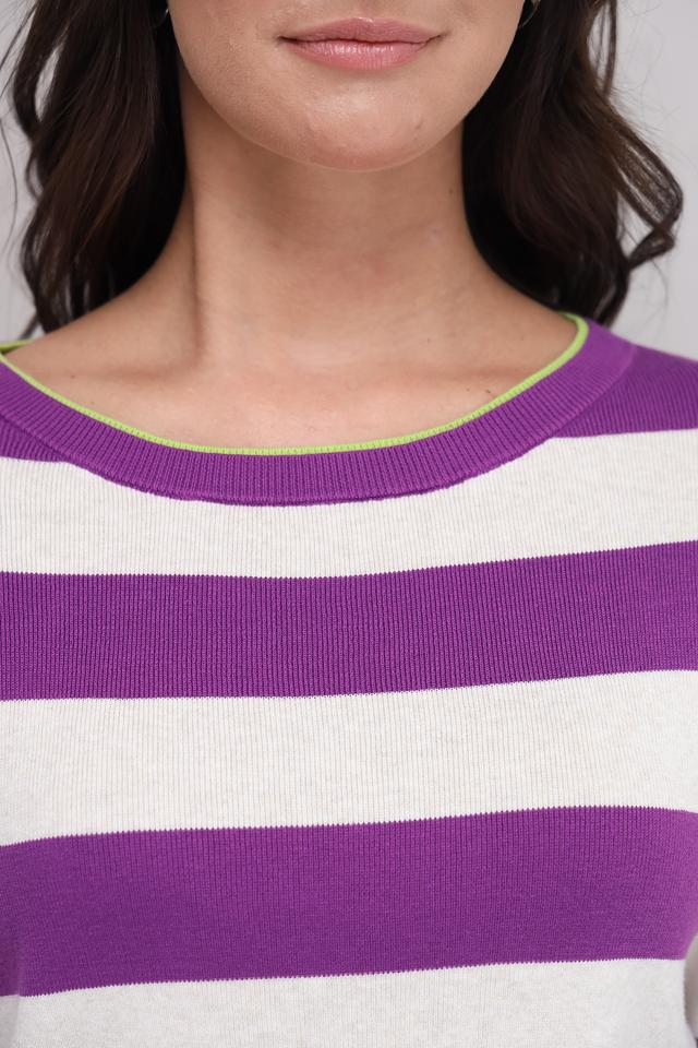 Этот женский пуловер от бренда Oui выполнен в классическом стиле с широкой полоской. Преобладающий цвет – насыщенный фиолетовый, чередующийся с белым. Пуловер имеет круглый вырез горловины, который дополнен тонкой отделкой лаймового цвета.