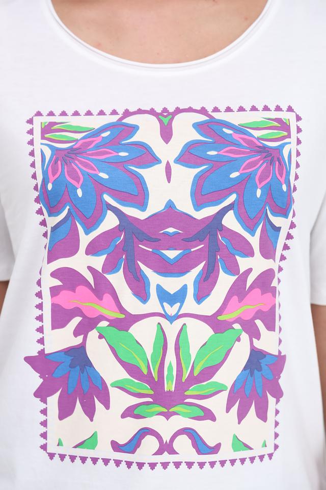 Особенностью данной модели является яркий цветочный принт, выполненный в фиолетовых, розовых и зеленых тонах. Принт расположен в центральной части футболки и придает ей оригинальный и свежий вид.