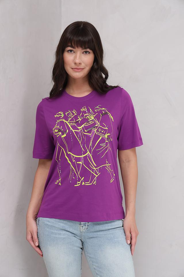 Женская футболка Oui фиолетового цвета с оригинальным принтом в виде танцующих фигур. Изготовлена из 100% хлопка, обеспечивающего комфорт и воздухопроницаемость. Стильный и удобный вариант для повседневного образа. Состав: хлопок 100%