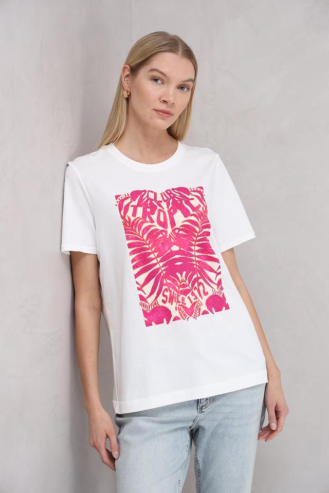 Белая футболка Oui с ярким розовым тропическим принтом станет отличным дополнением к вашему летнему гардеробу. Изготовлена из 100% хлопка, обеспечивая комфорт и воздухопроницаемость. Состав: хлопок 100%