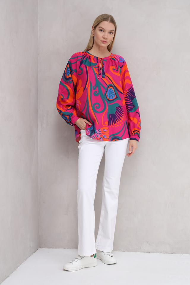 Особенностью данной модели является эффектный цветочный принт в ярких оттенках фуксии, оранжевого, зелёного и синего. Эта блуза идеально подойдет для создания как повседневных, так и праздничных образов. Она прекрасно сочетается с белыми брюками, джинсами или юбками.
