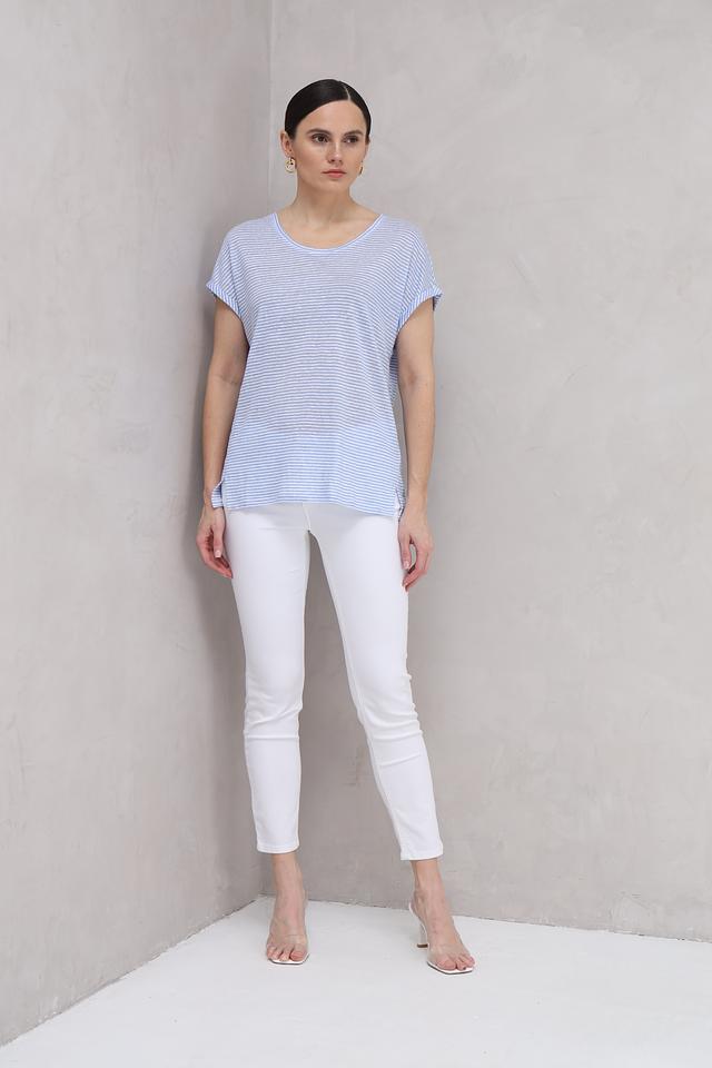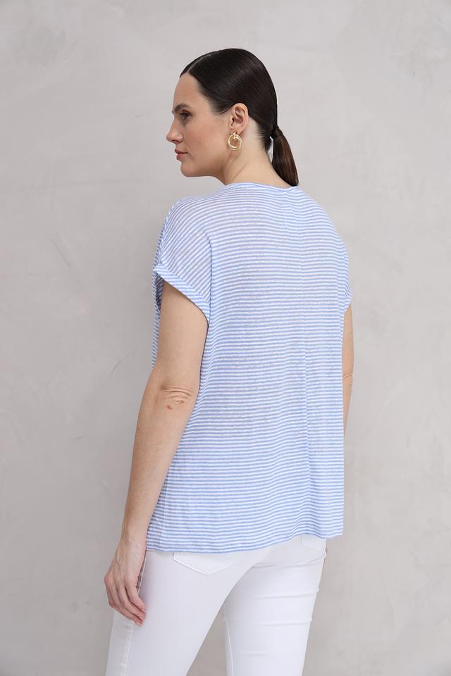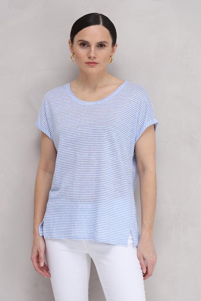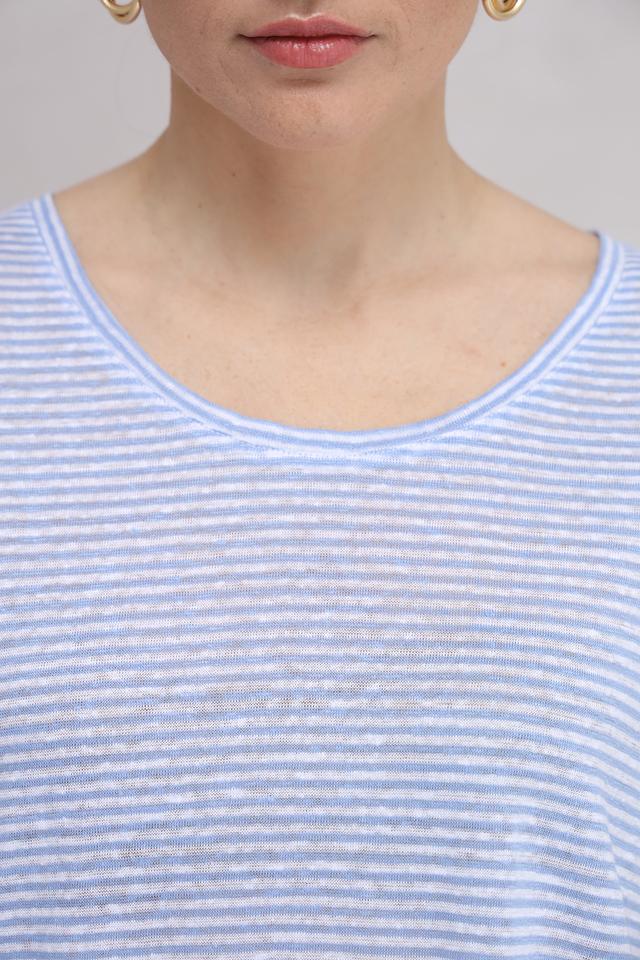 Женская футболка Oui голубого цвета в тонкую полоску. Модель выполнена из 100% льна, имеет округлый вырез горловины и короткий рукав с манжетой. Лёгкий и дышащий материал идеально подходит для летнего сезона. Состав: лен 100%