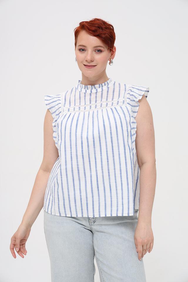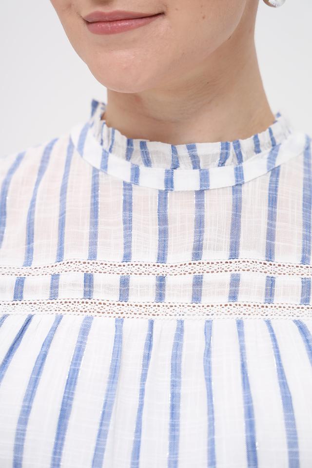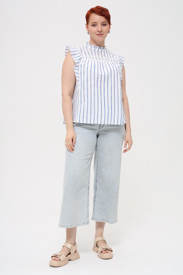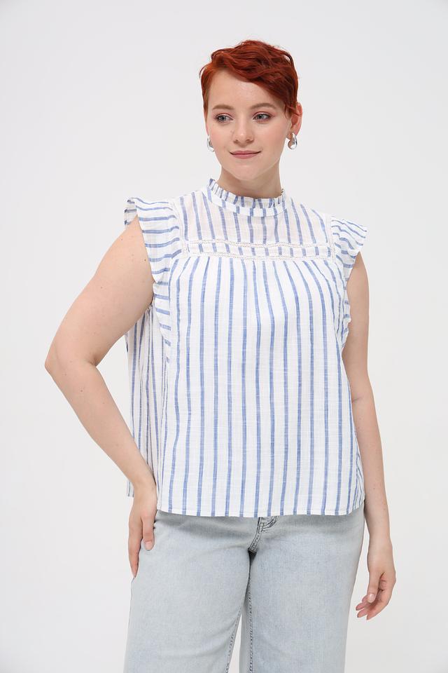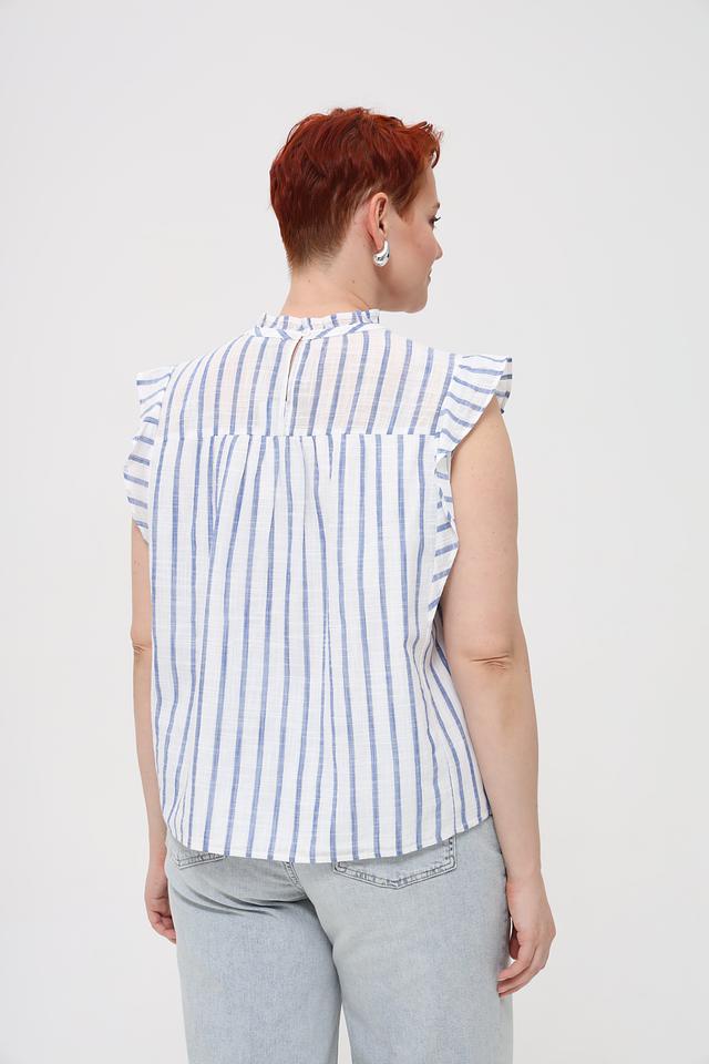 Блуза Oui голубого цвета в белую полоску — стильная модель с короткими рукавами и декоративными рюшами. Изготовлена из натурального хлопка с добавлением металлизированной нити, что придает ей особый шарм. Состав: хлопок 98%, метализ.нить 2%