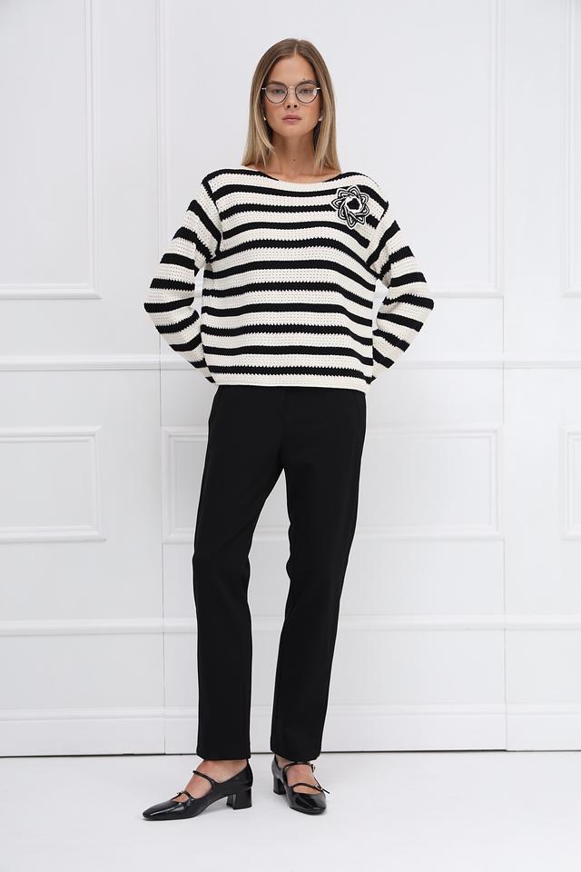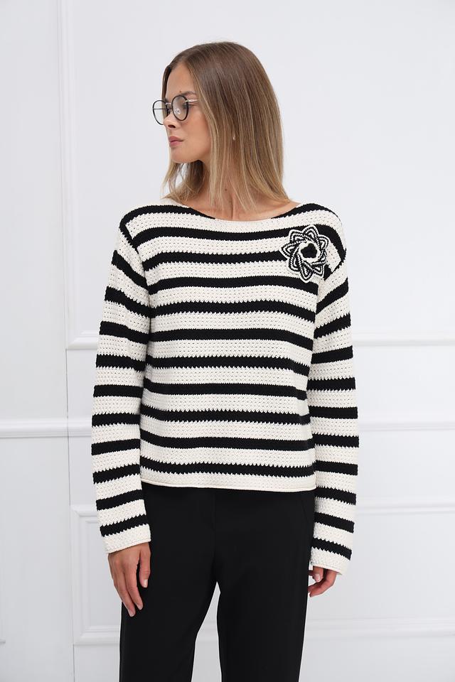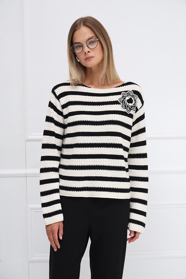 Женский пуловер Oui белого и черного цвета в горизонтальную полоску, украшен вышитым цветком. Модель выполнена из мягкого хлопка и имеет удобный крой. Состав: хлопок 100%