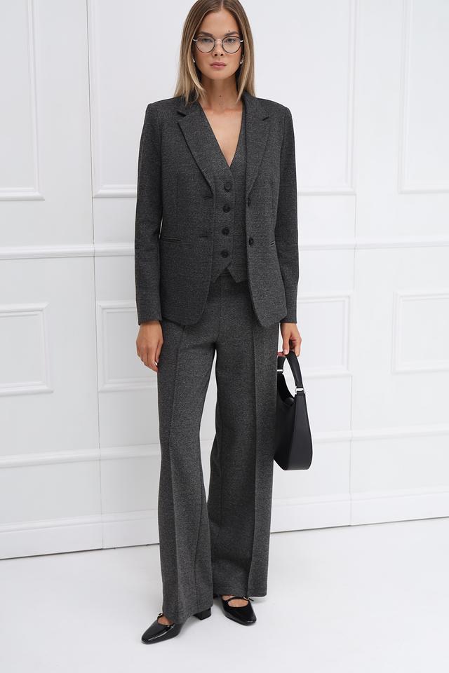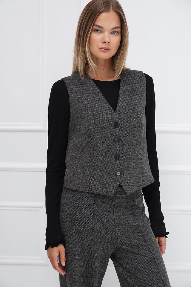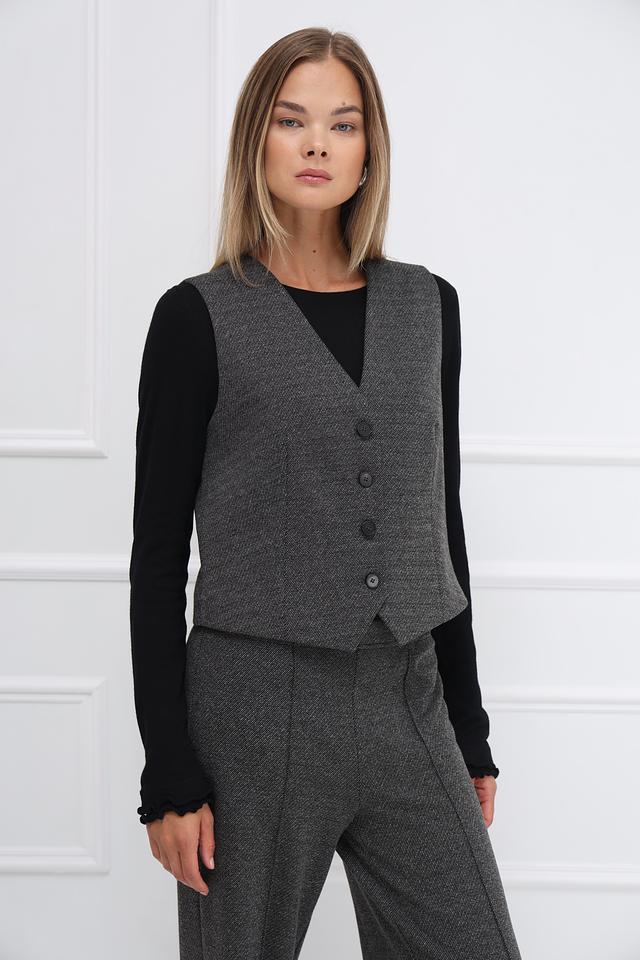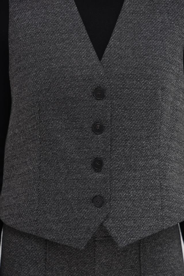Жилет имеет V-образный вырез и застегивается на ряд пуговиц. Крой прямой, слегка приталенный, что подчеркивает фигуру. Изготовлен из высококачественной смесовой ткани, состоящей из полиэстера, хлопка, вискозы и эластана.