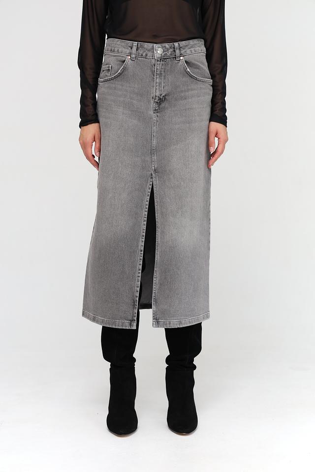 Юбка имеет классический серый цвет и длину миди. Прямой крой и асимметричный разрез спереди придают ей современный и элегантный вид. Модель застегивается на молнию и пуговицу.