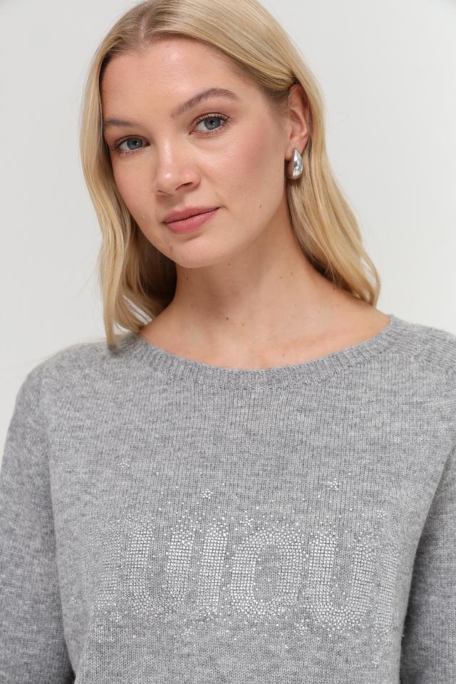 Модель имеет прямой крой, короткие рукава и круглый вырез горловины. Особый акцент в дизайне пуловера – декоративные стразы, формирующие надпись на передней части изделия. Такой декор придает образу изысканность и индивидуальность.