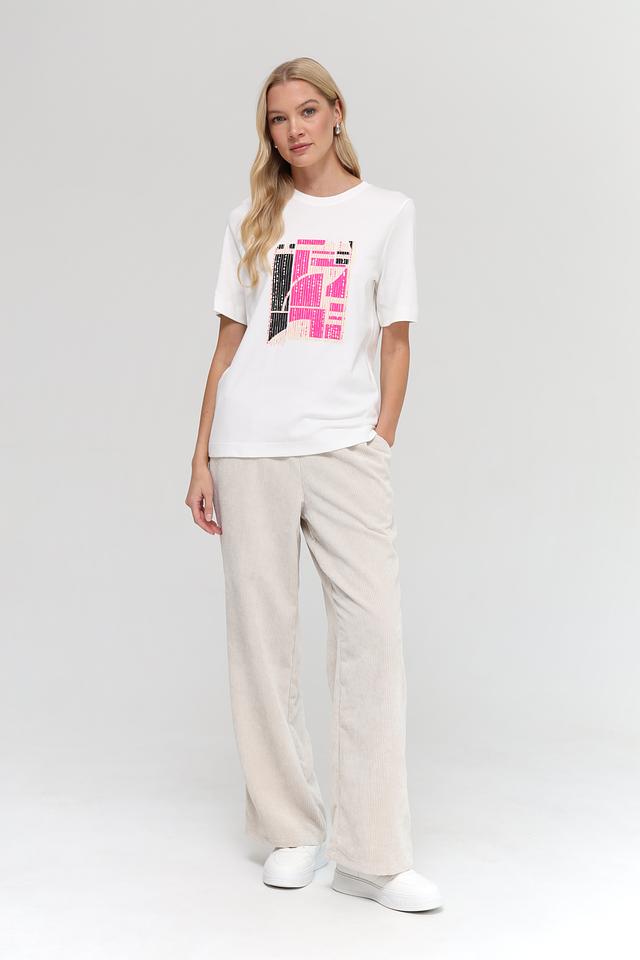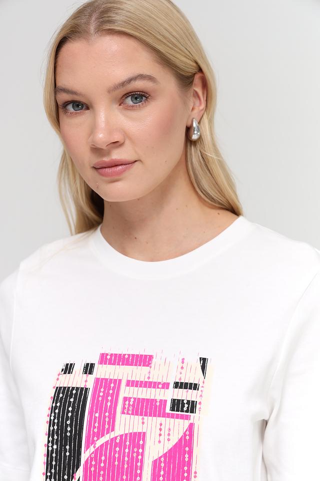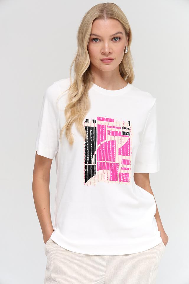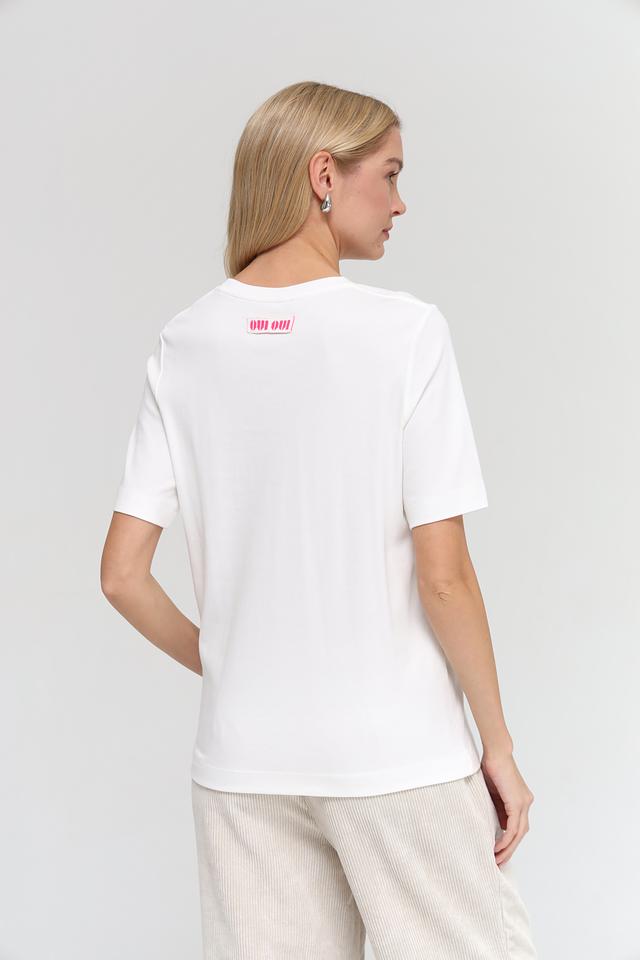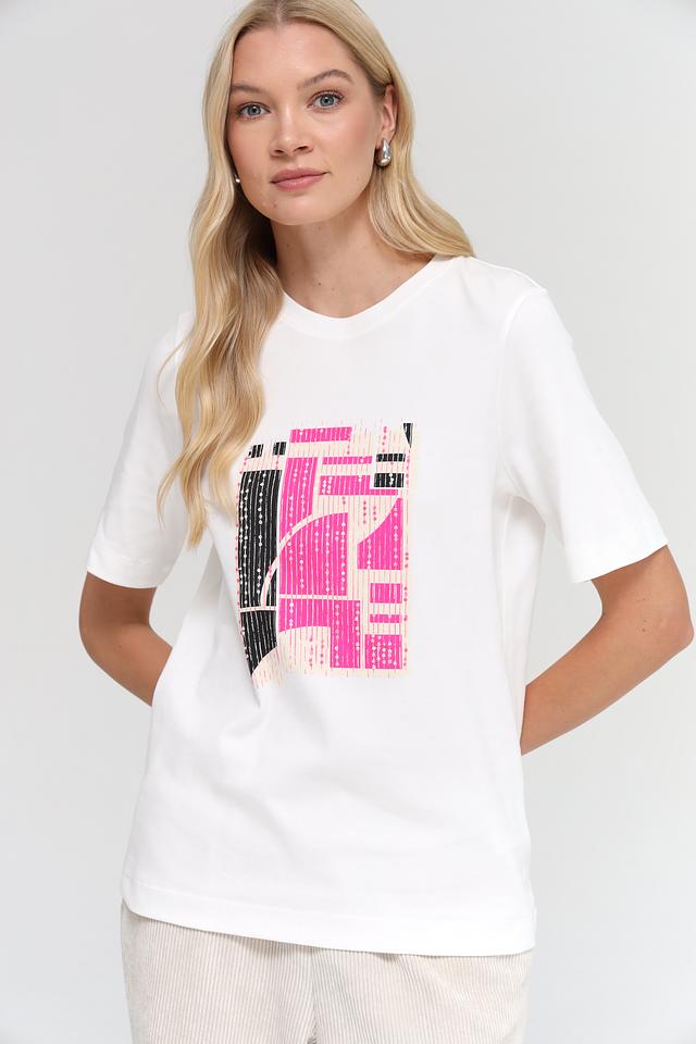 Белая футболка от Oui с ярким абстрактным принтом. Модель из 100% хлопка отличается свободным кроем и короткими рукавами, идеально подходит для создания повседневных образов. Состав: хлопок 100%