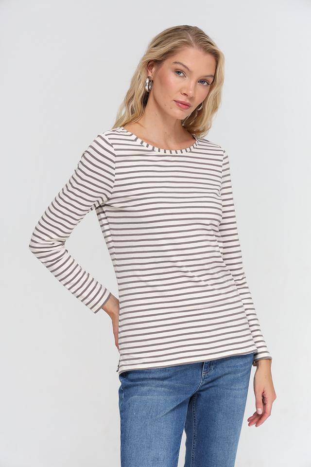 Женская футболка Oui серого цвета с классическим полосатым принтом. Изготовлена из мягкого и приятного к телу сочетания хлопка и модала, обеспечивающего комфорт в носке. Отличный выбор для создания повседневных образов. Состав: хлопок 47%, модал 47%, эластан 6%