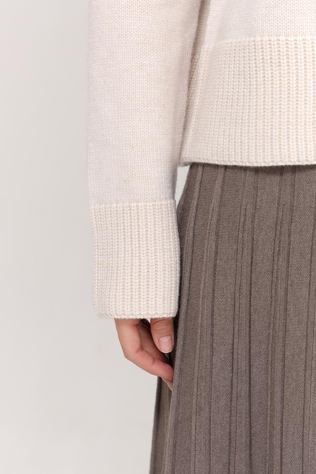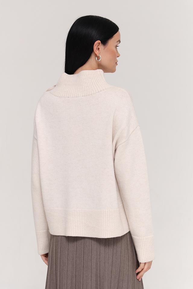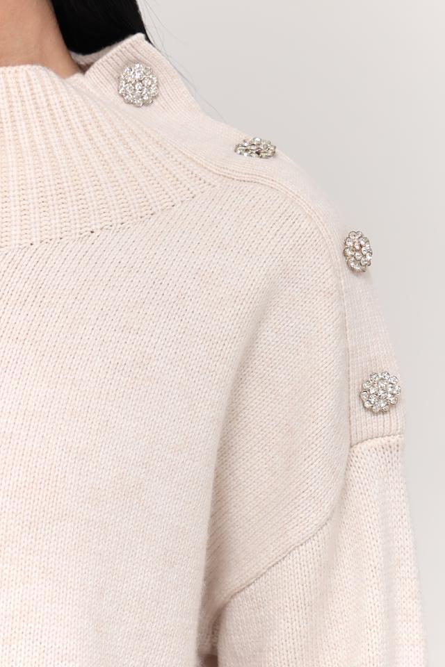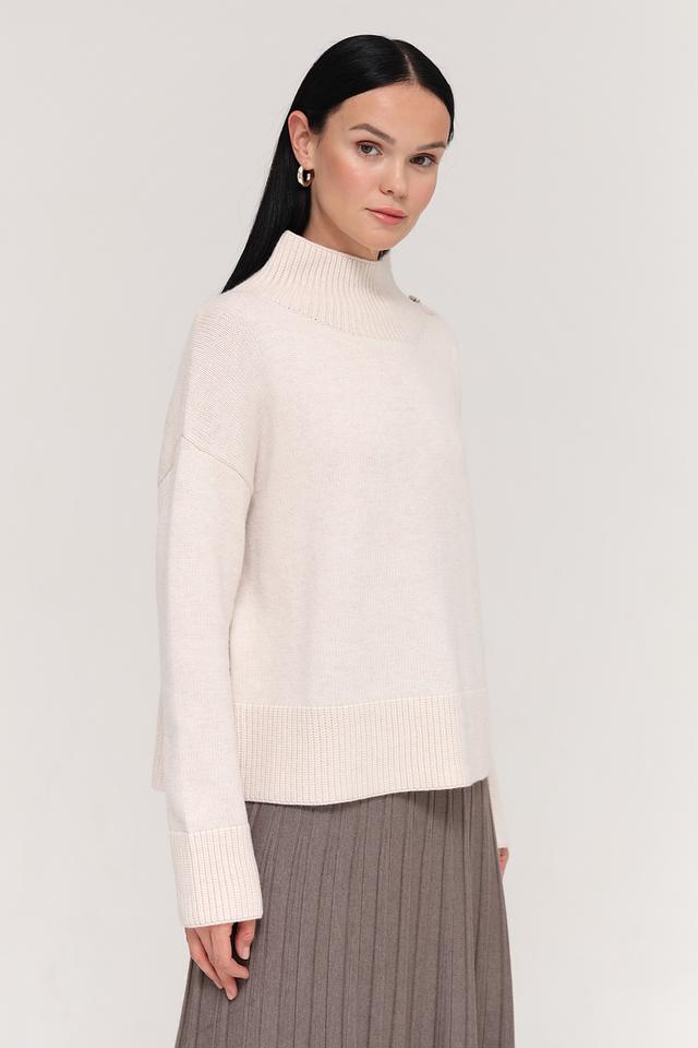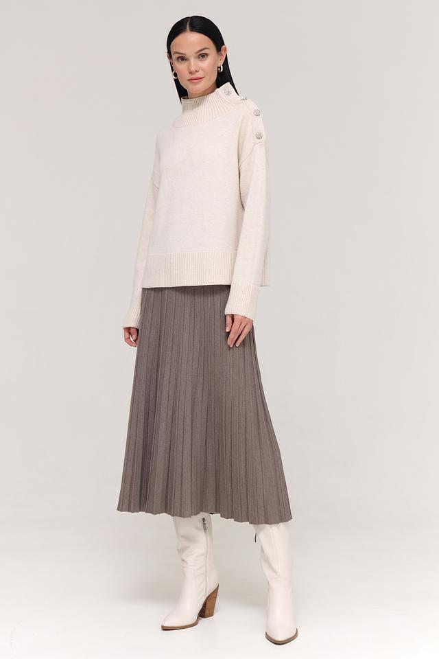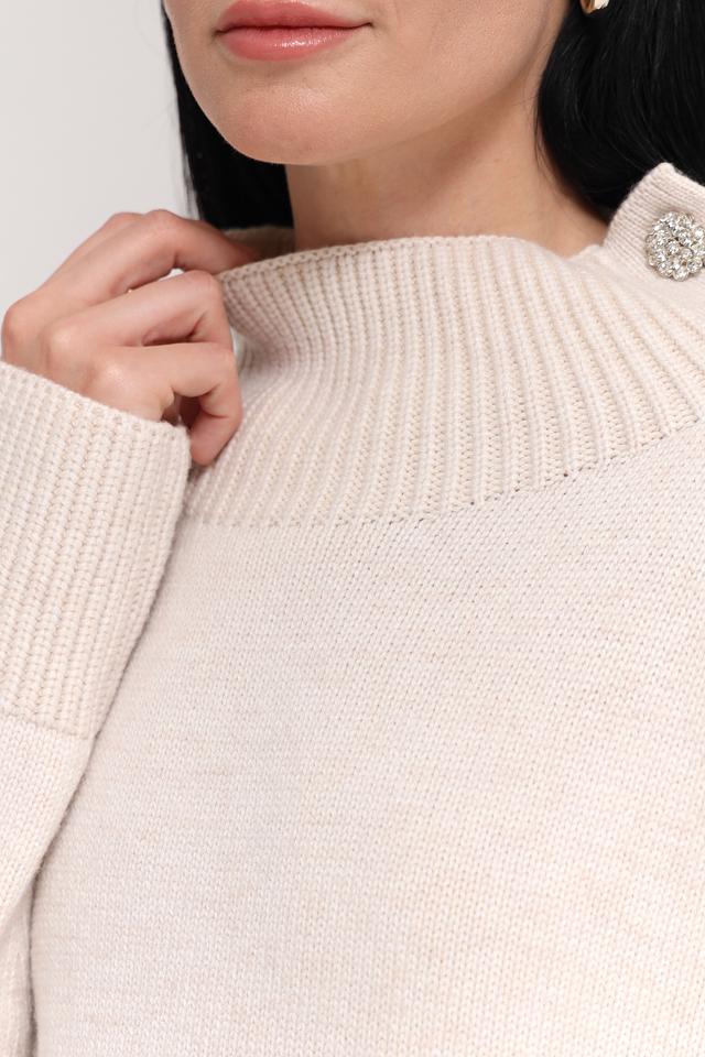 Пуловер имеет приятный бежевый цвет и украшен декоративными пуговицами на плечах, что придает ему особый шарм. Воротник-стойка добавляет изысканности, а свободный крой обеспечивает свободу движений и комфорт в носке.