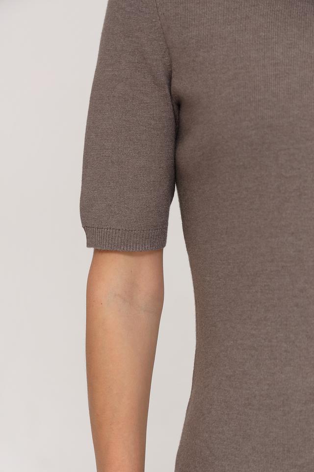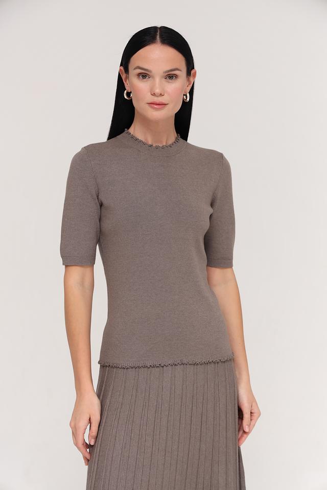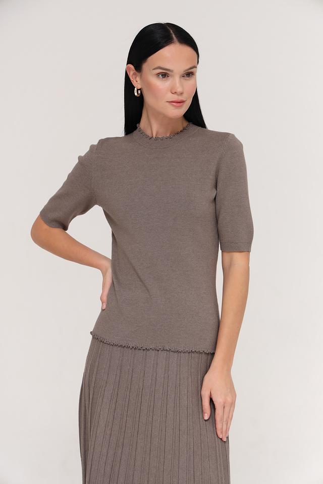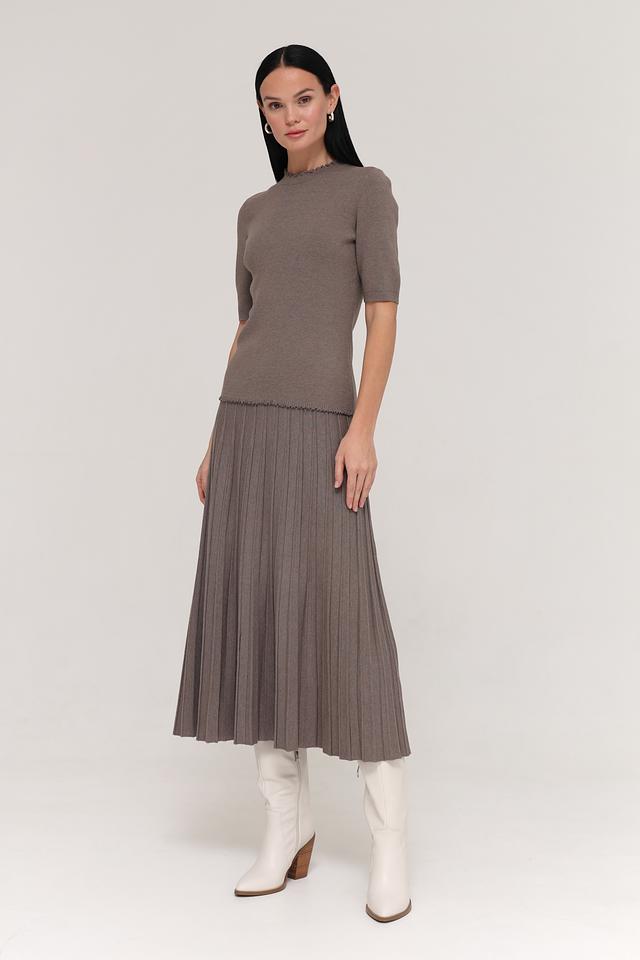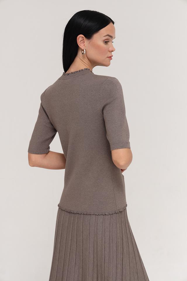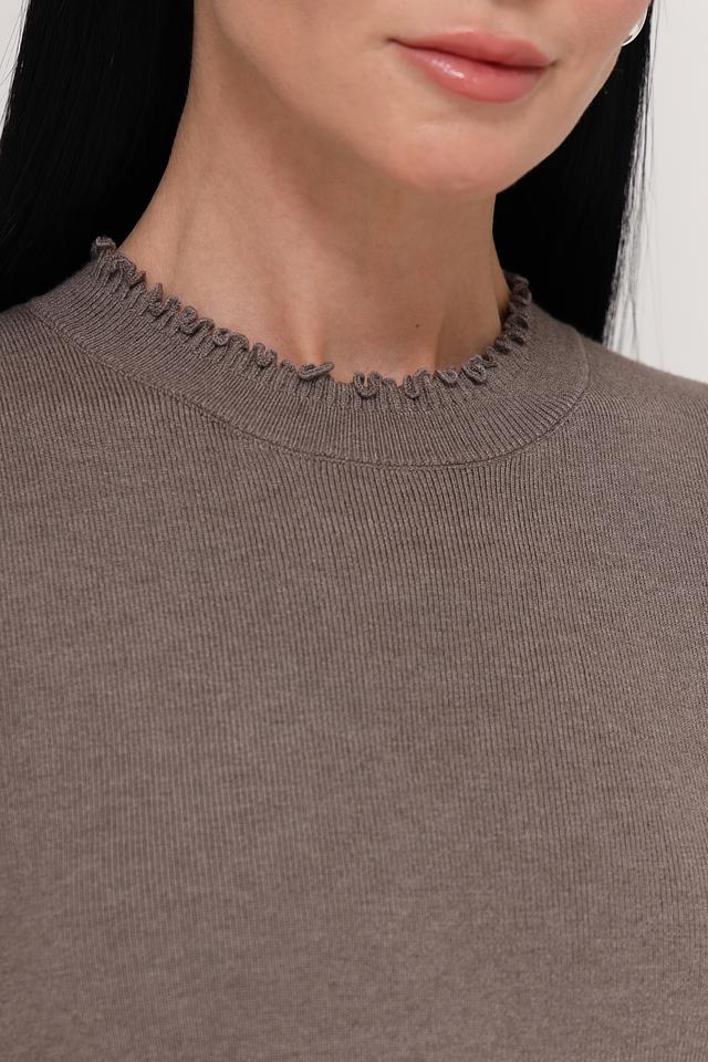 Модель имеет короткий рукав и круглую горловину, украшенную декоративной оборкой. Благодаря своему лаконичному дизайну, этот пуловер легко сочетается с различными предметами одежды, создавая стильные и комфортные образы.