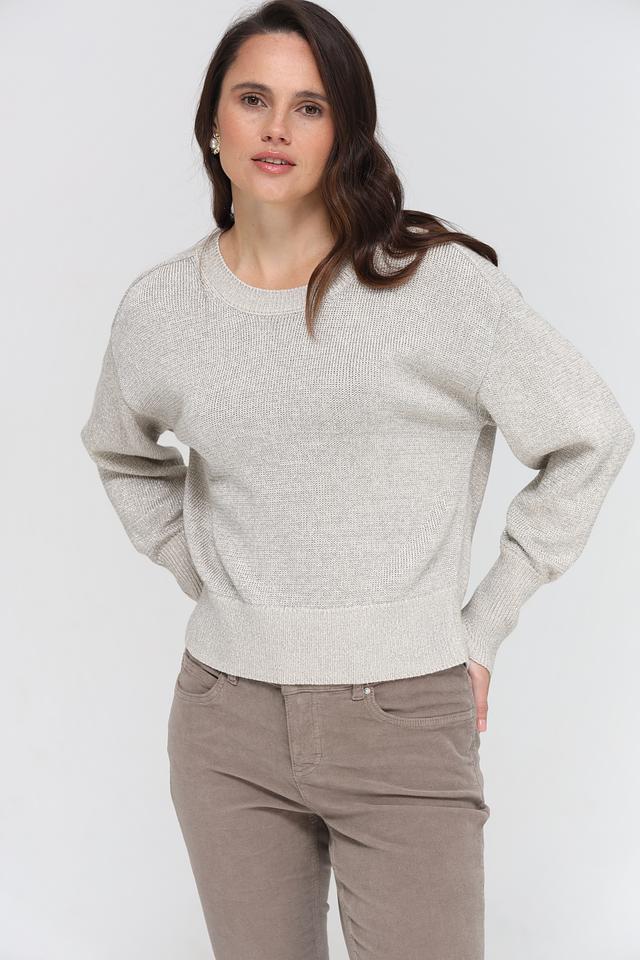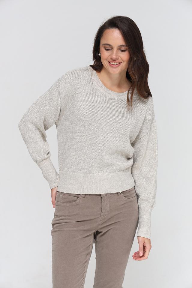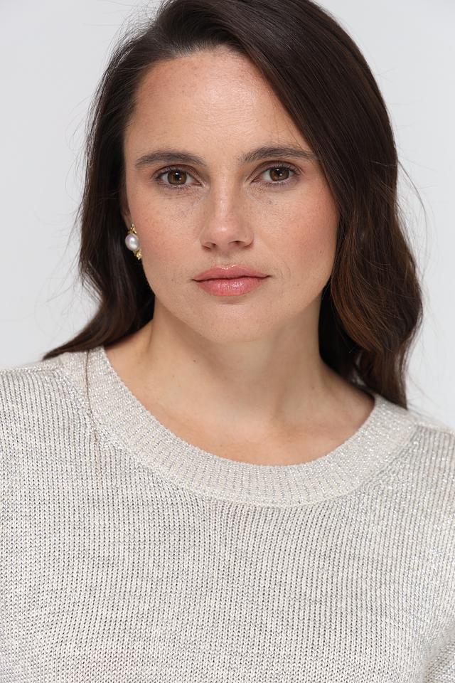 Пуловер имеет классический крой с округлым вырезом горловины и длинными рукавами. Слегка спущенная линия плеч придает модели более расслабленный и современный вид. Текстура вязки и добавление люрекса создают легкий мерцающий эффект, который добавляет изделию изысканности.